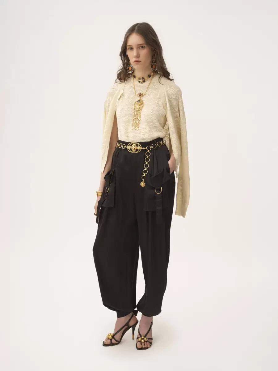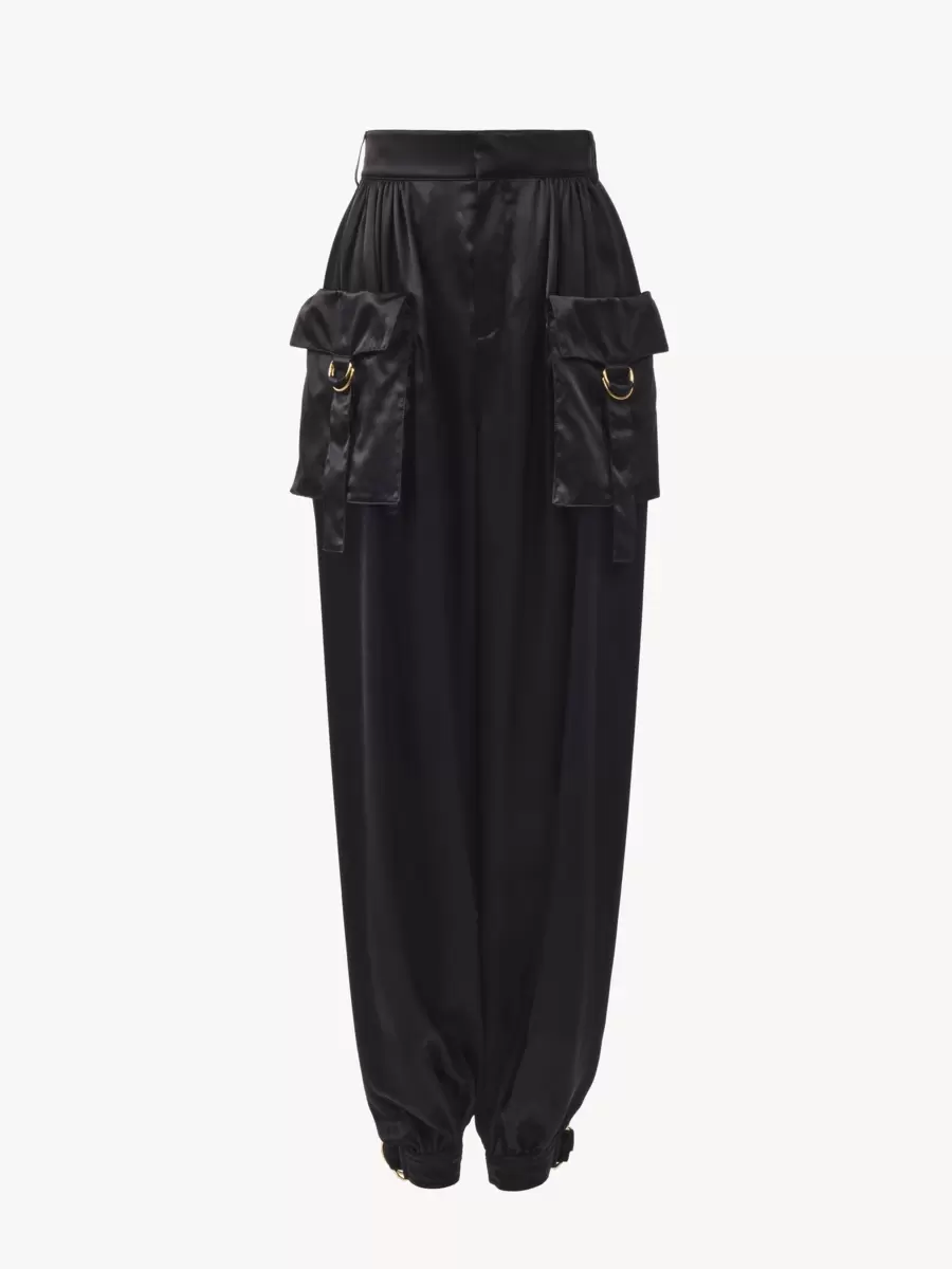 Fluid cargo pants in silk satin, featuring oversized flap pockets at the front. Gold-tone D-rings detail the pockets and tapered cuff tabs.