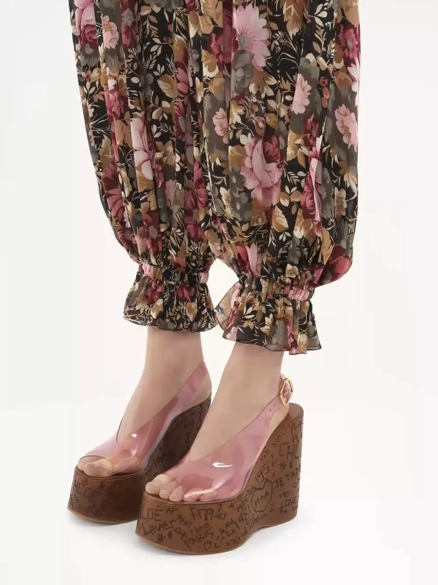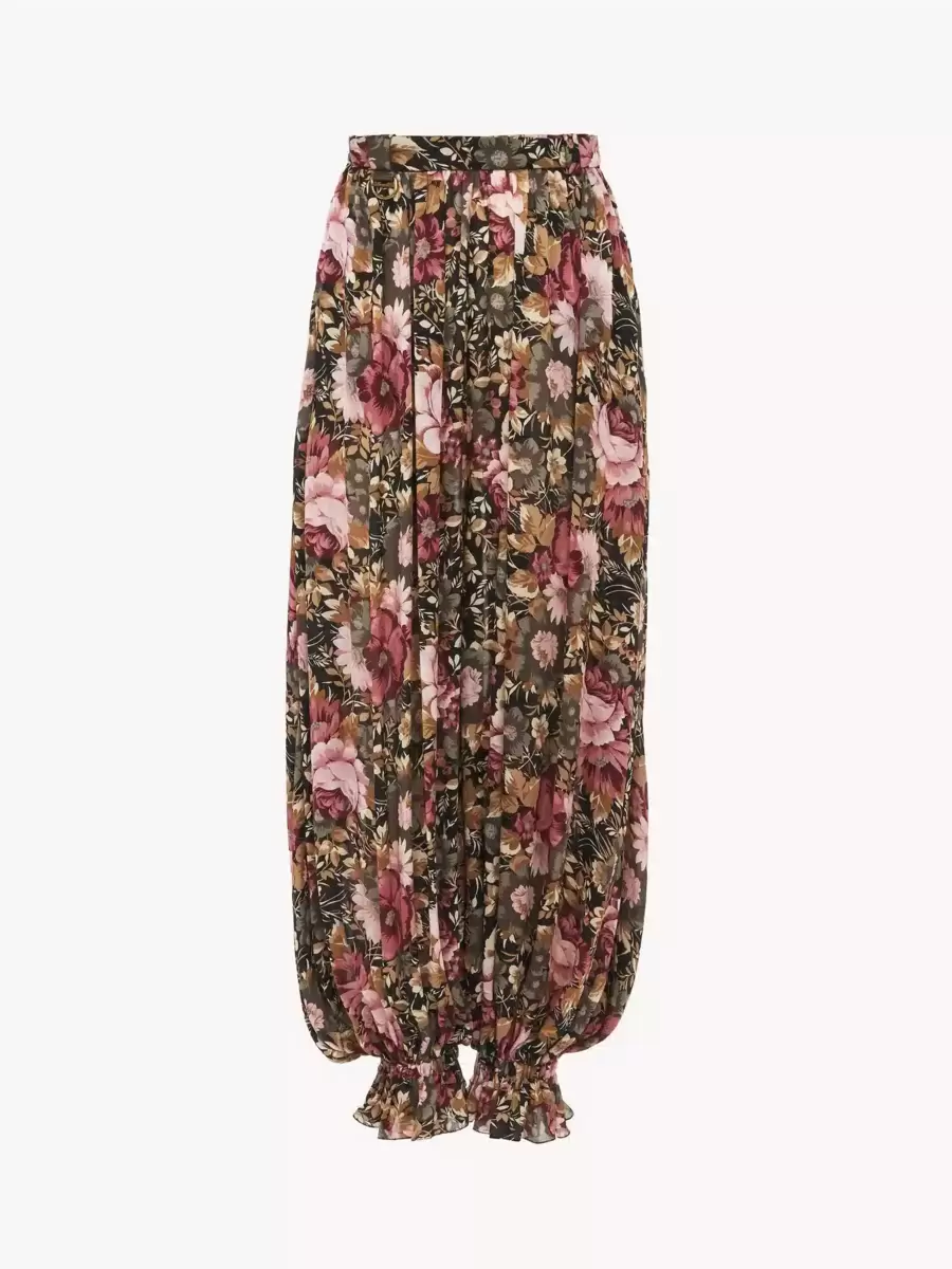 Fluid pleated pants in organic silk charmeuse with a roses print inspired by the Maison’s heritage. The cropped silhouette is gathered at the elasticated ankles, which are detailed with fabric-covered buttons. A gold-tone D-ring signs the right hip.