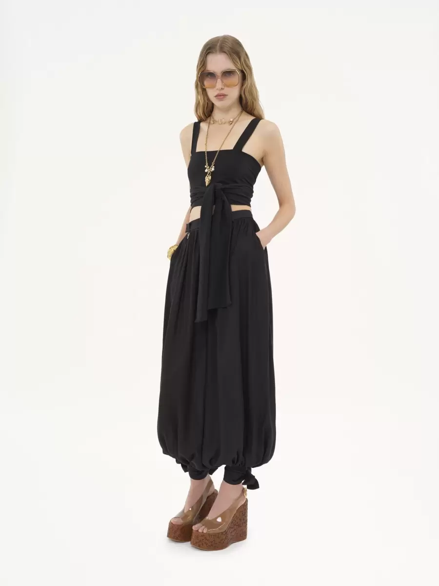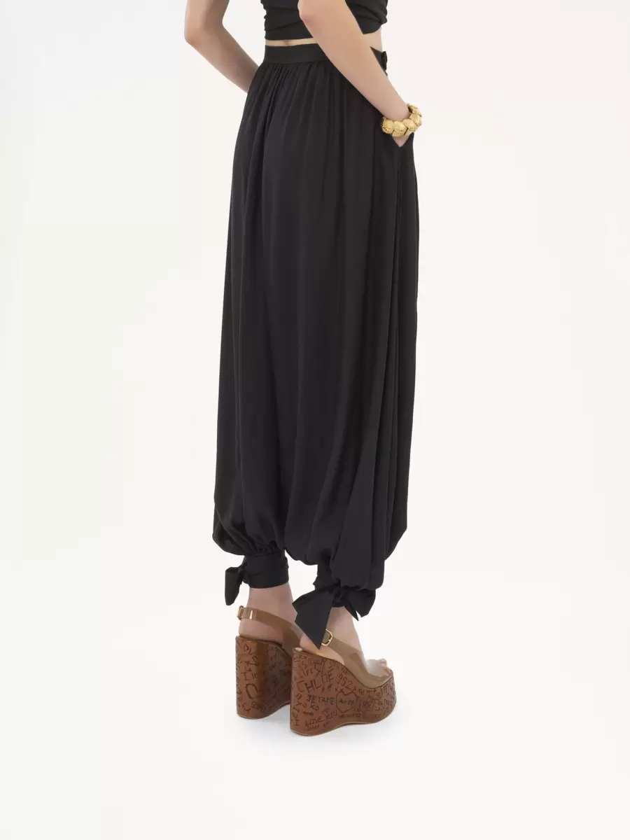 Fluid pleated pants in light silk charmeuse with a separate shorts lining. The cropped silhouette is gathered at the ankles, which are detailed with fabric-covered buttons. A gold-tone D-ring signs the right hip.