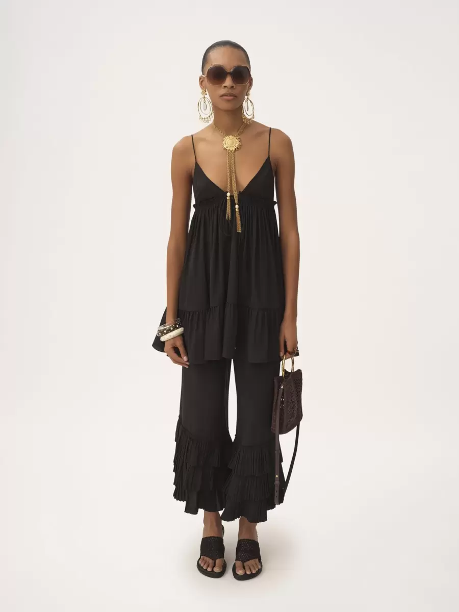 – Ruffled silk pants