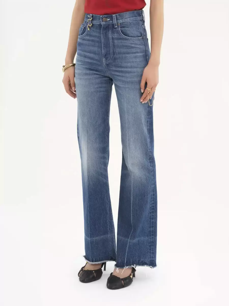 High-rise bootcut jeans in waterless denim with a raw hem, featuring a gold-toned metal snake embellishment around one of the belt loops.