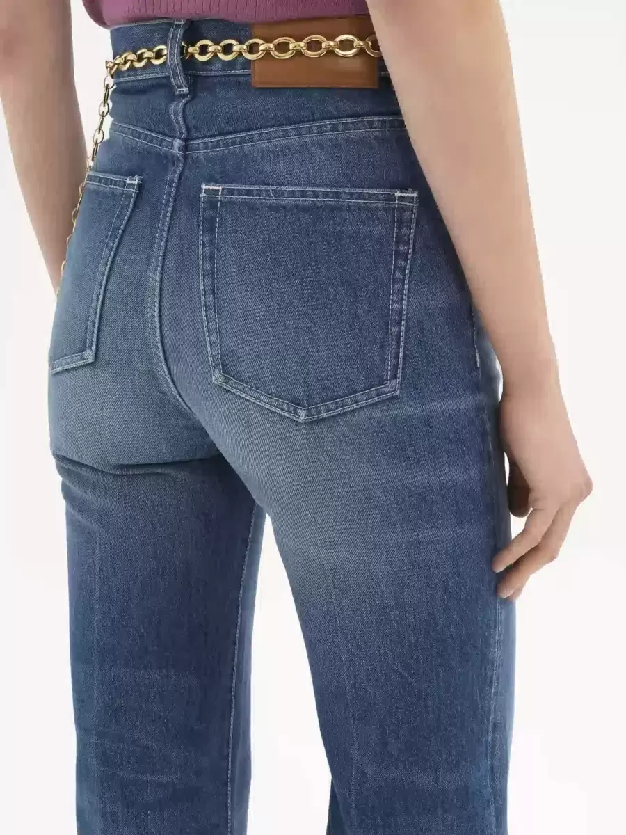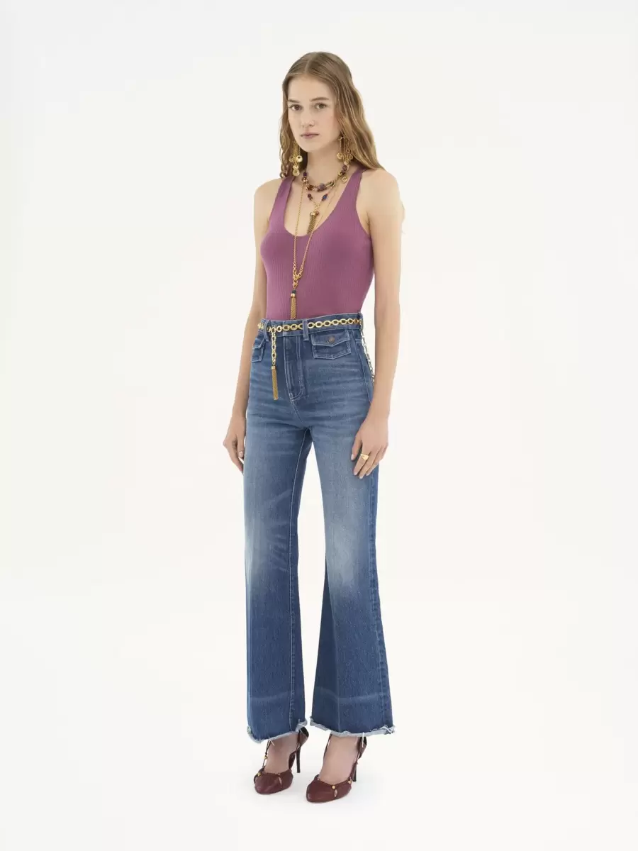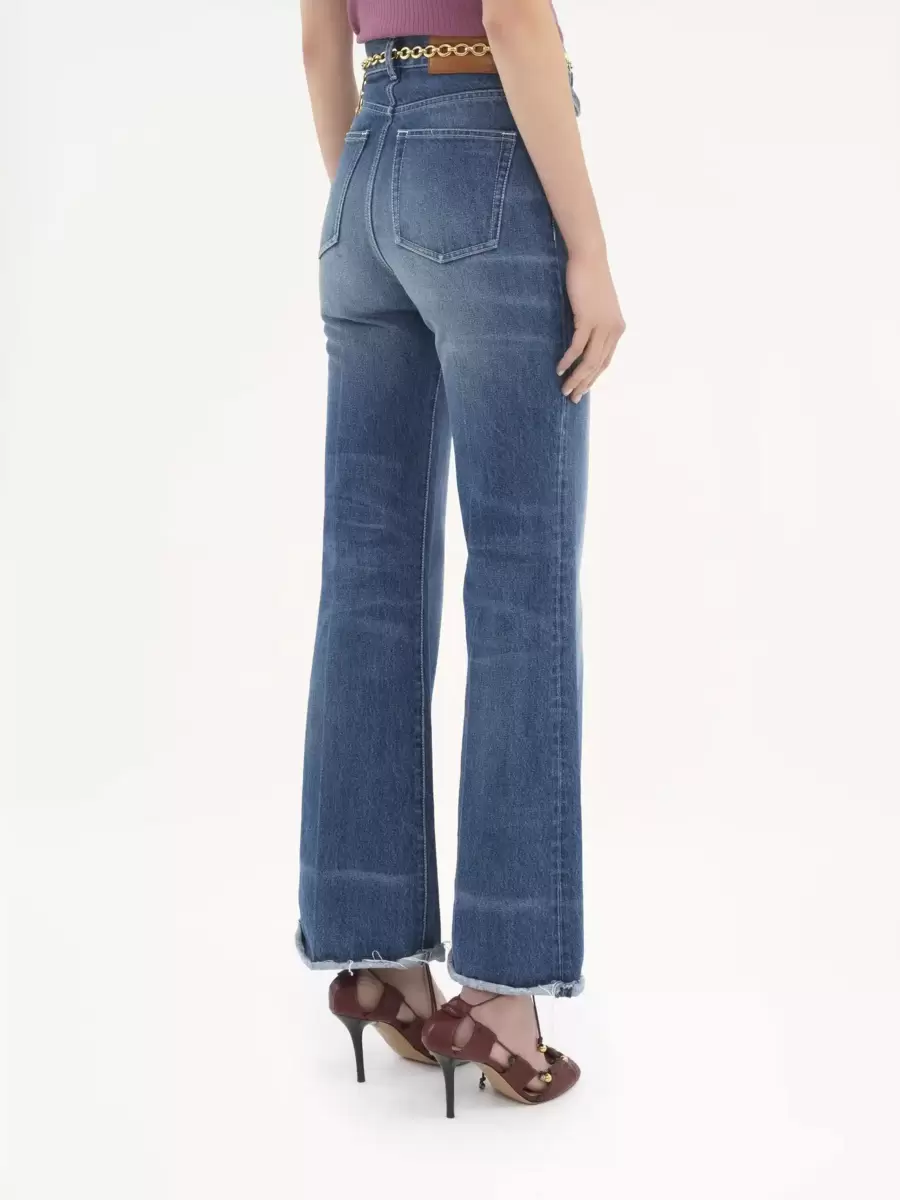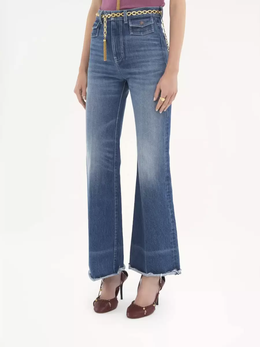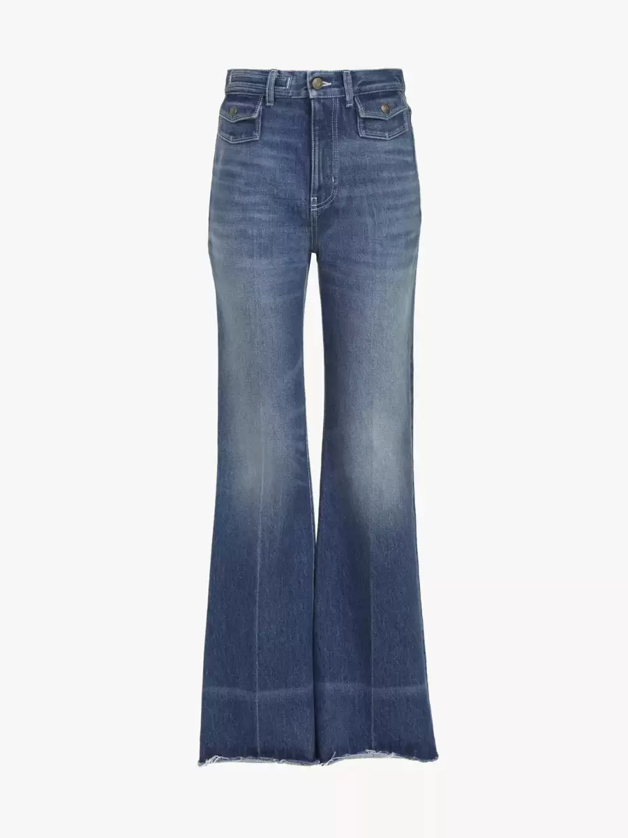 High-rise flare jeans in cotton denim, with buttoned front patch pockets and a raw hem.