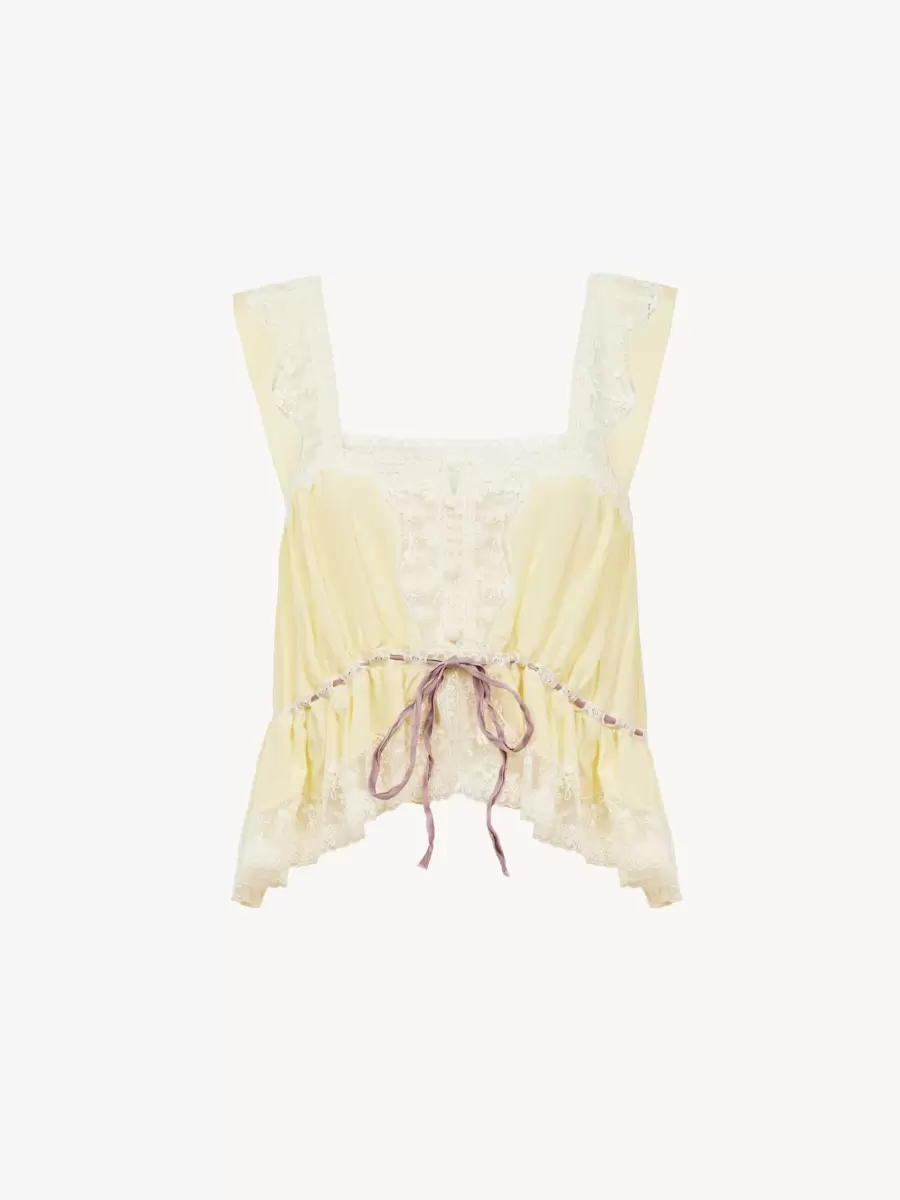 Square-neck cropped top in soft silk habotai with lace trims, fabric-covered buttons and a drawstring waist.