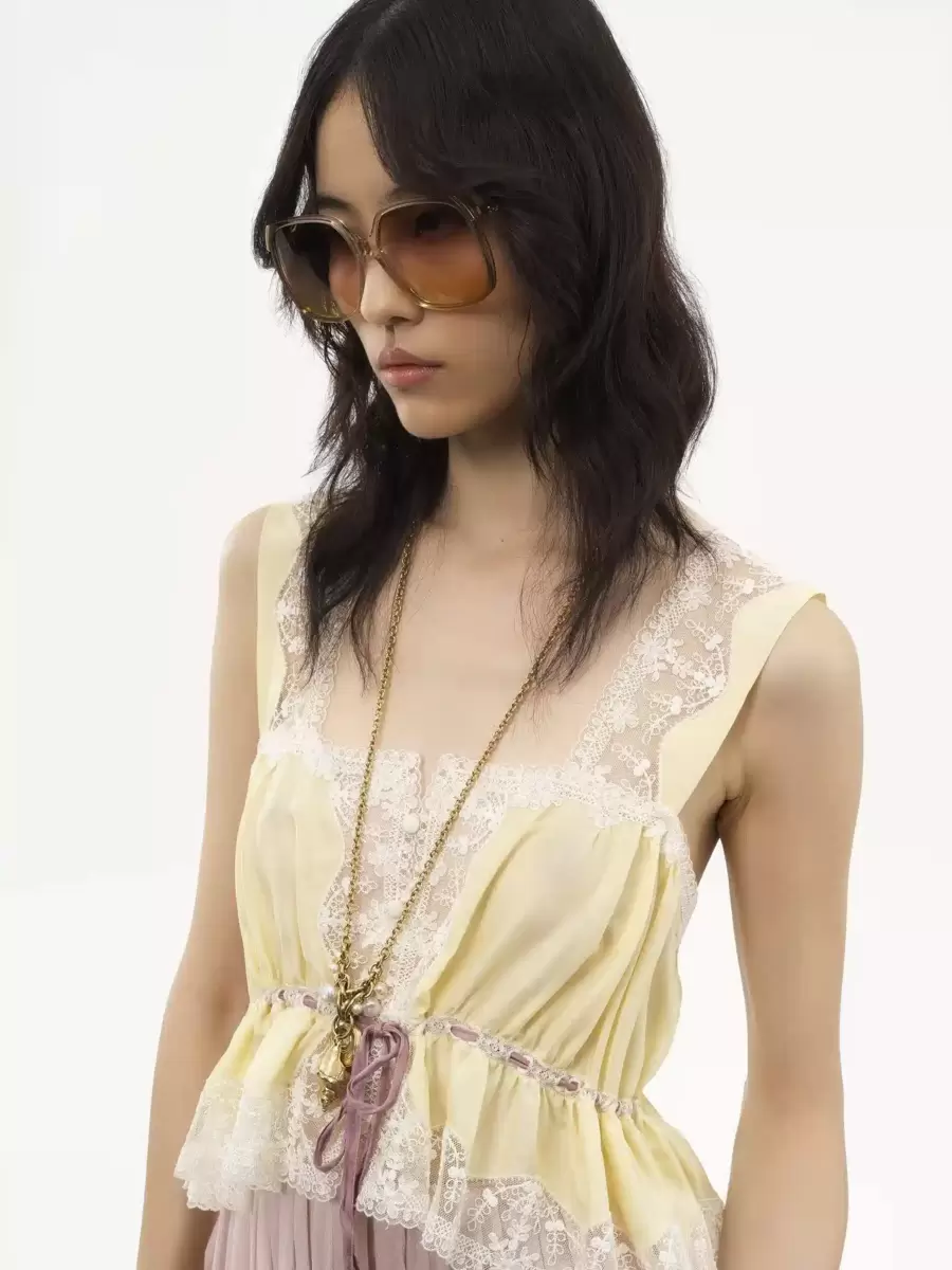 This product was made by Marie Helene Couture, a long-standing partner of Chloé based in Morlaas, France. Marie Helene Couture excels in the specialized technique of couture “flou.” Their expertise aligns with the rigorous standards set by the “métiers de la mode, vêtement flou” certification, ensuring a high level of professional aptitude in this delicate and skilled art form.