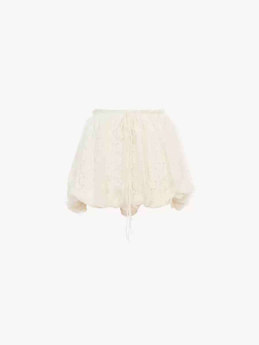 Fluid, gathered mini bloomer shorts in organic silk mousseline with floral lace embellishments and a silk-mix lining. The drawstring waist has dangling ties finished with gold-tone tips.