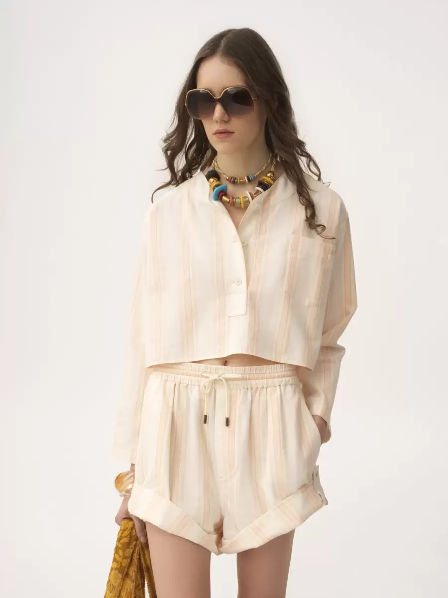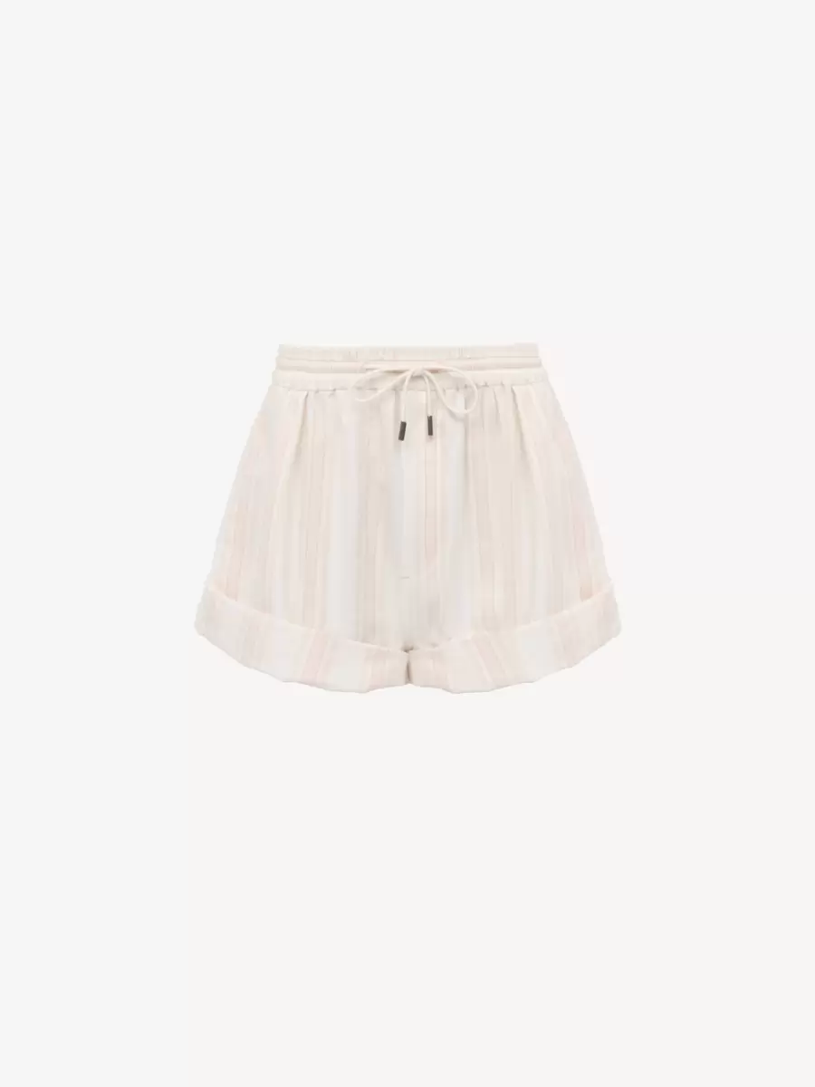 Drawstring shorts in soft striped organic cotton with buttoned turn-ups, an elasticated drawstring waist with Chloé-engraved tips, and Chloé logo embroidery at the back.