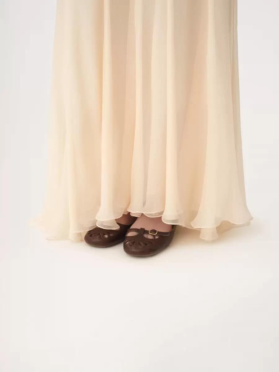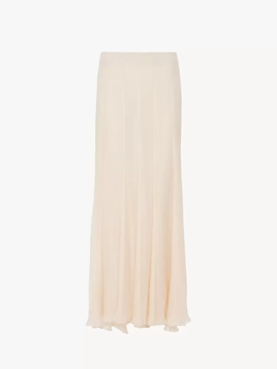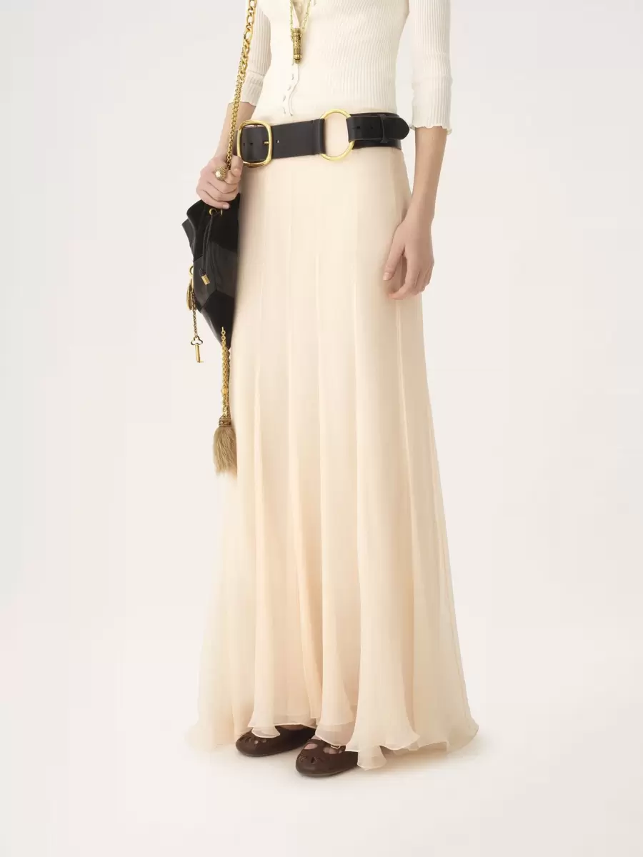 Gathered fluid maxi skirt in organic silk mousseline with a silk-mix lining, detailed with flounces.