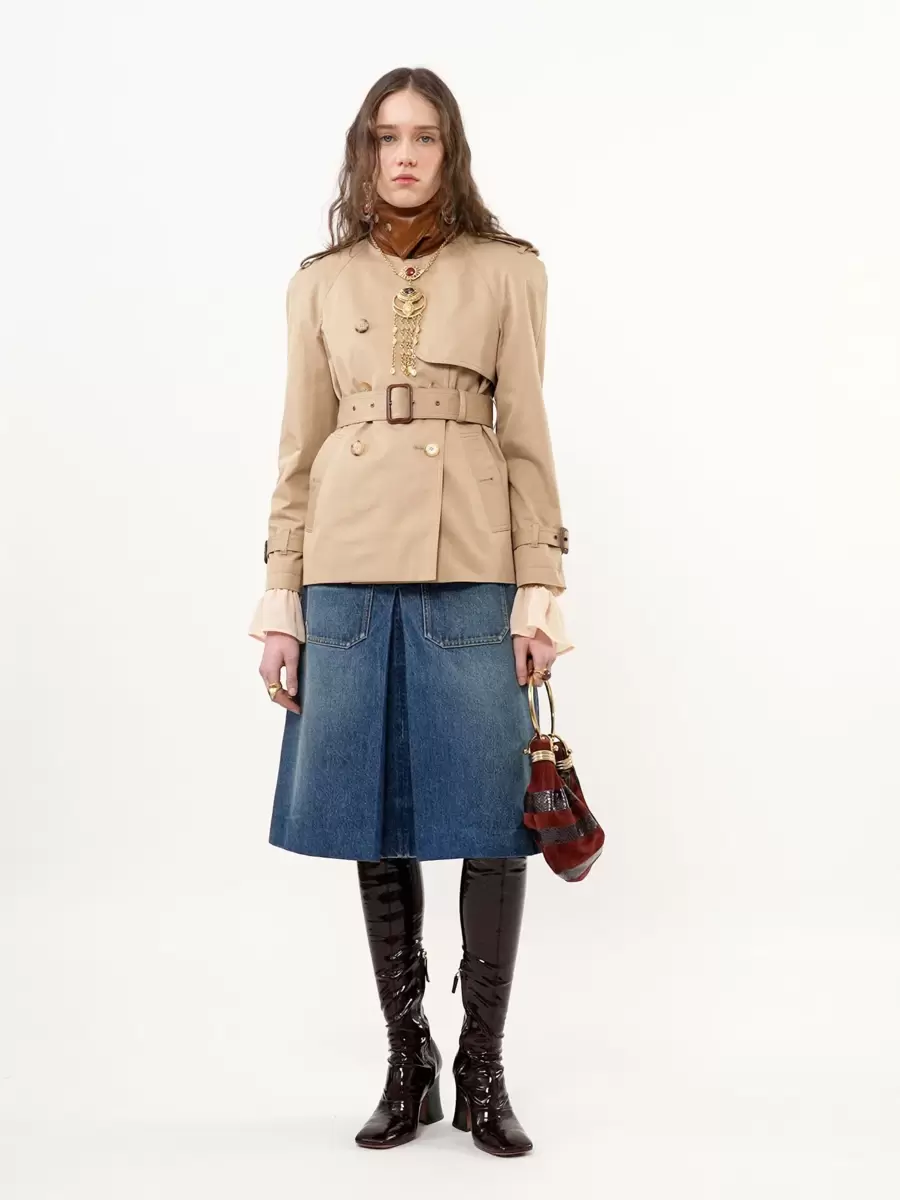 Knee-length skirt in broken blue organic cotton denim with Chloé-engraved buttons, oversized patch pockets with diagonal zippers, and a front box pleat.