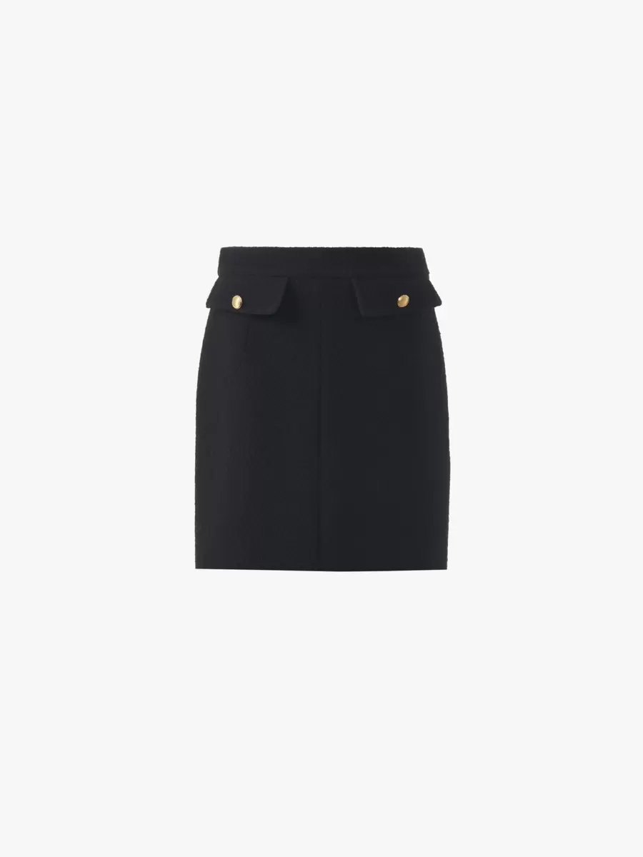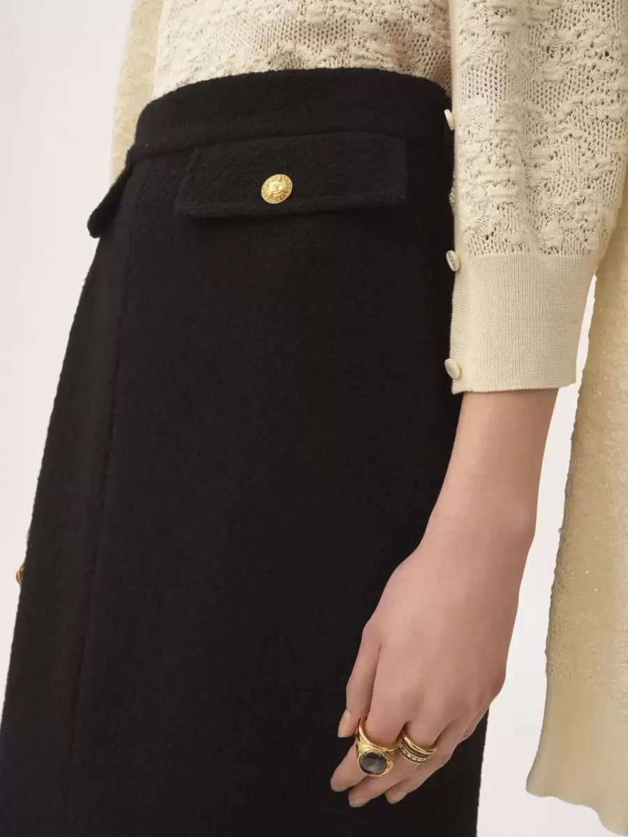 Tailored knee-length skirt in wool bouclette with front flap pockets and gold-tone buttons.