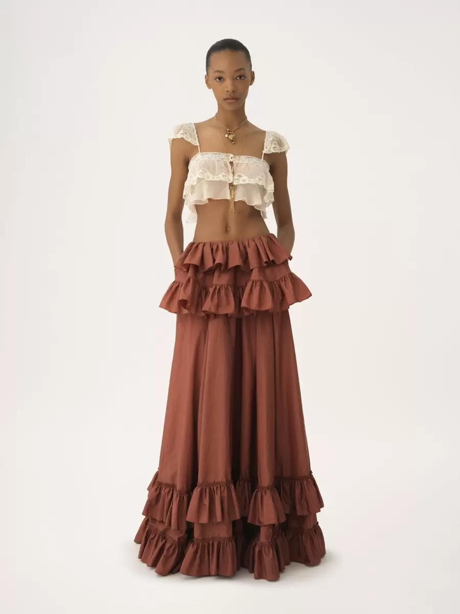 Tiered maxi skirt in washed light silk taffeta with generous ruffles.