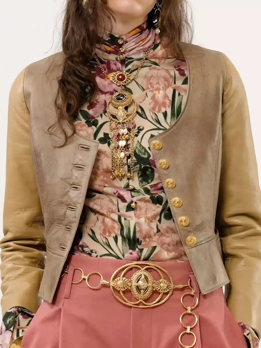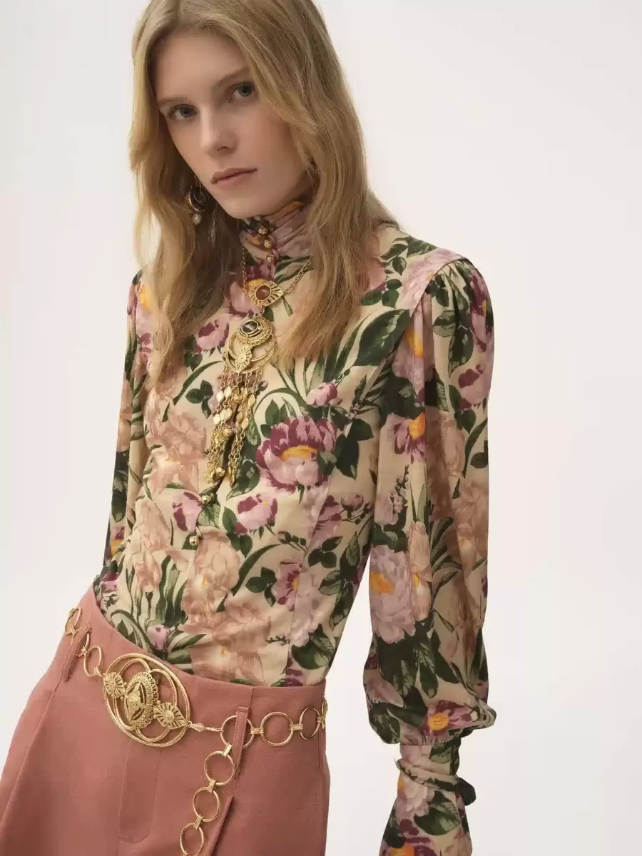 Fitted mock-neck top in wool jersey with a floral print, featuring gold-tone sphere buttons, gathered shoulders and knotted ties at the cuffs.