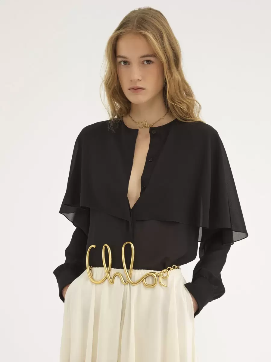 Cape blouse in organic silk georgette featuring a round-neck collar and buttoned cuffs.