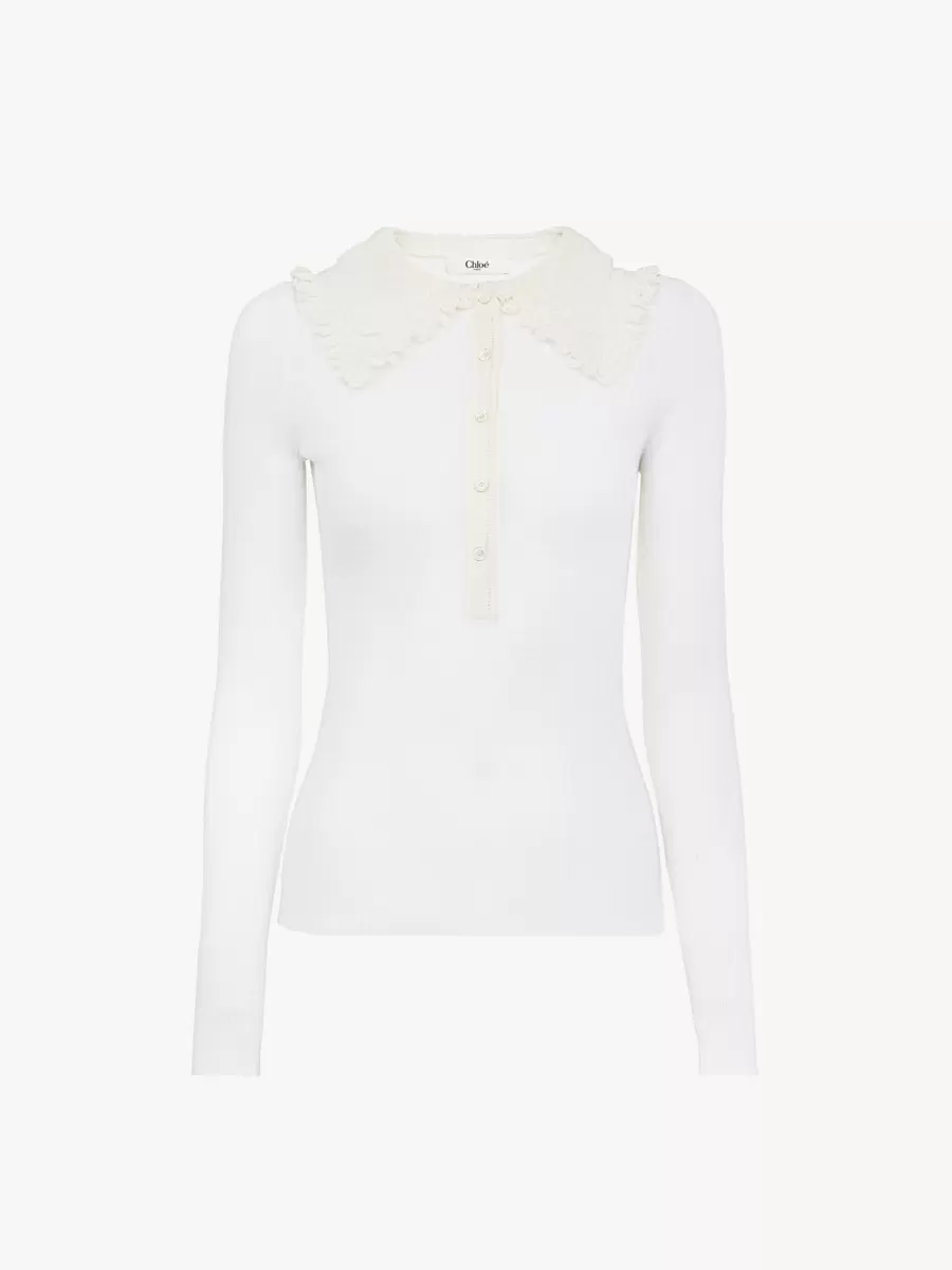 Fitted Henley shirt in a superfine wool ribbed knit, featuring a lace-trimmed collar and a mother-of-pearl button placket.