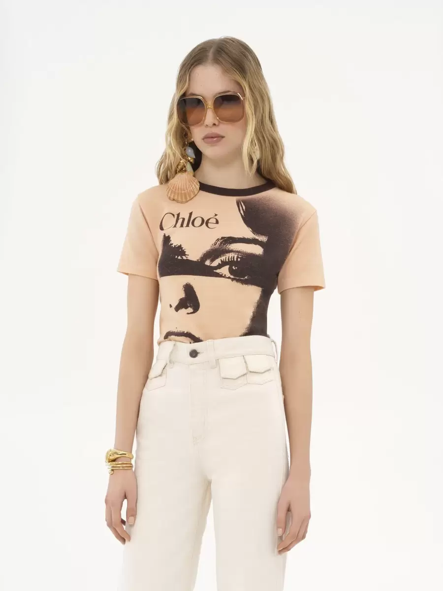 Fitted crew-neck T-shirt in piqué jersey featuring a large portrait print and Chloé logo at the front, finished with a contrast neckline.