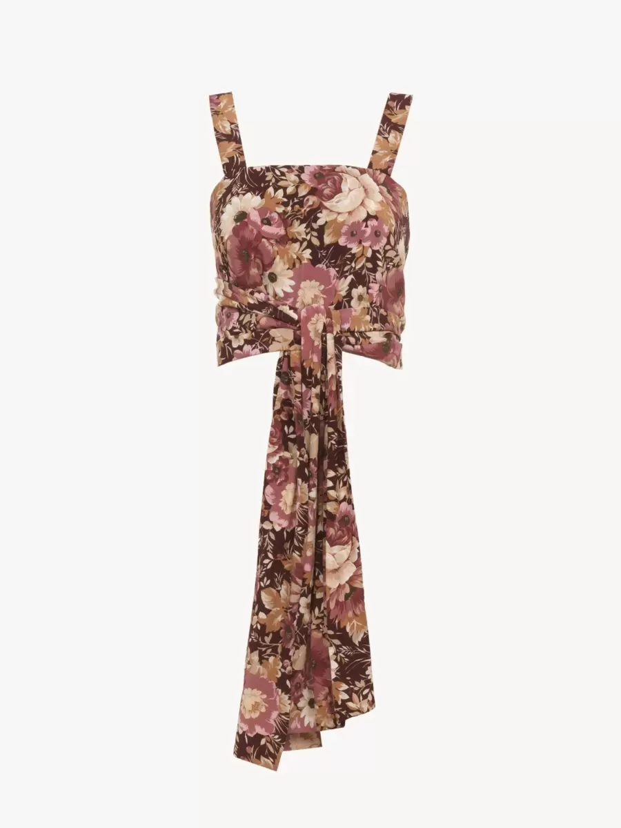 Cropped front-tie tank top in organic silk crêpe de chine with a roses print inspired by the Maison’s Archives, featuring a square neckline and long ties knotted at the front.