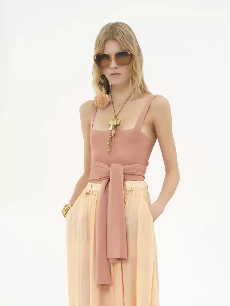 Cropped front-tie tank top in a second-skin shiny viscose knit, combining a square neckline with long ties knotted at the front. Chloé logo embroidery signs this piece on the left.
