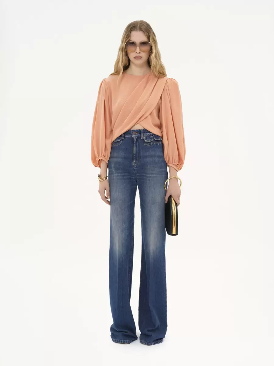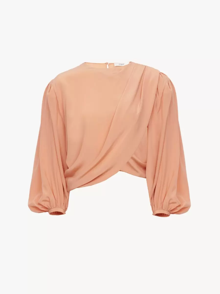 Draped cropped top in organic silk crêpe de chine, featuring puff sleeves and a fabric-covered button at the back.