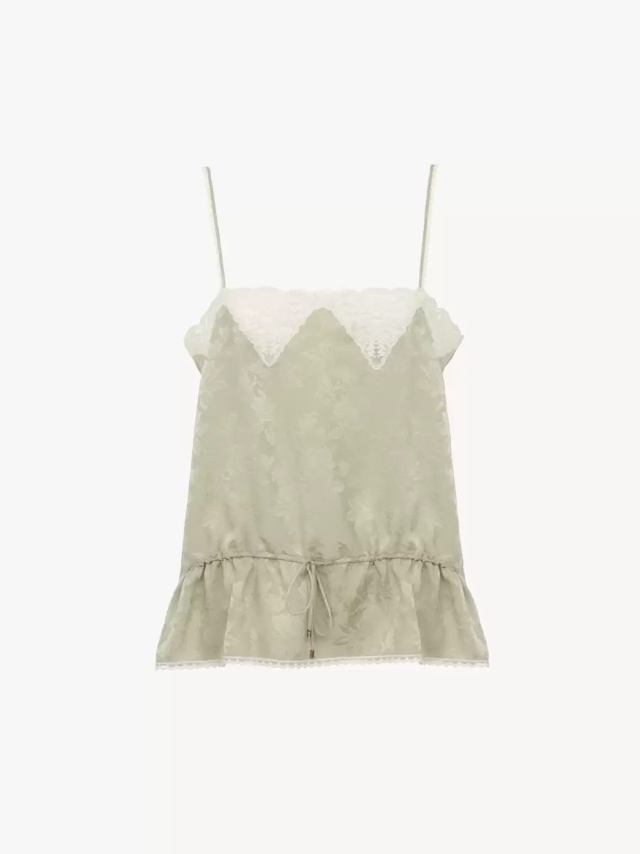 Thin-strap camisole top in organic silk with a roses jacquard, featuring lace trims and a drawstring waist finished with gold-tone metal tips.