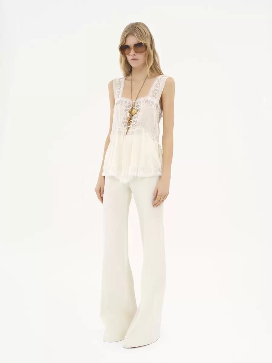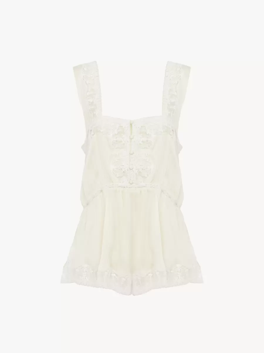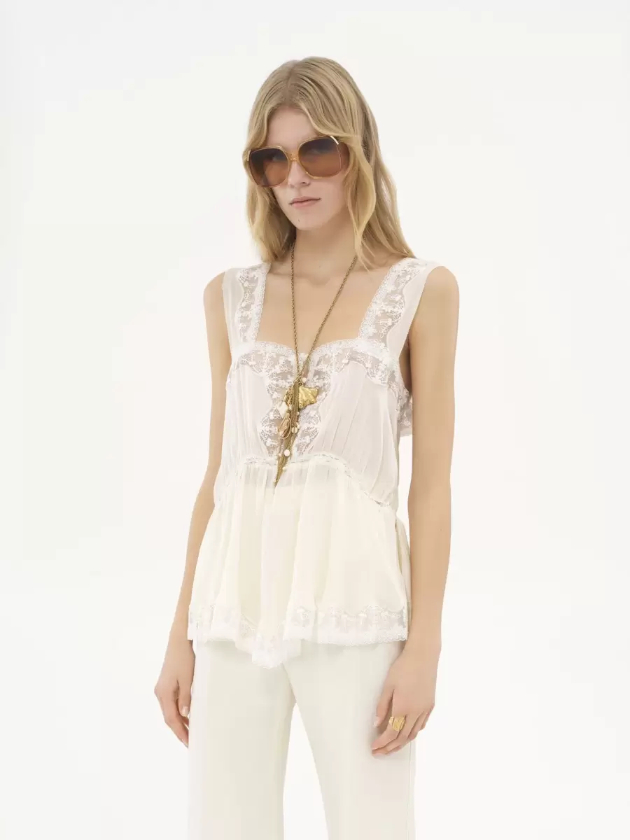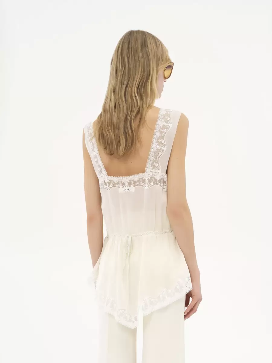 Fluid tank top in light silk charmeuse with lace trims, fabric-covered buttons and a drawstring waist.