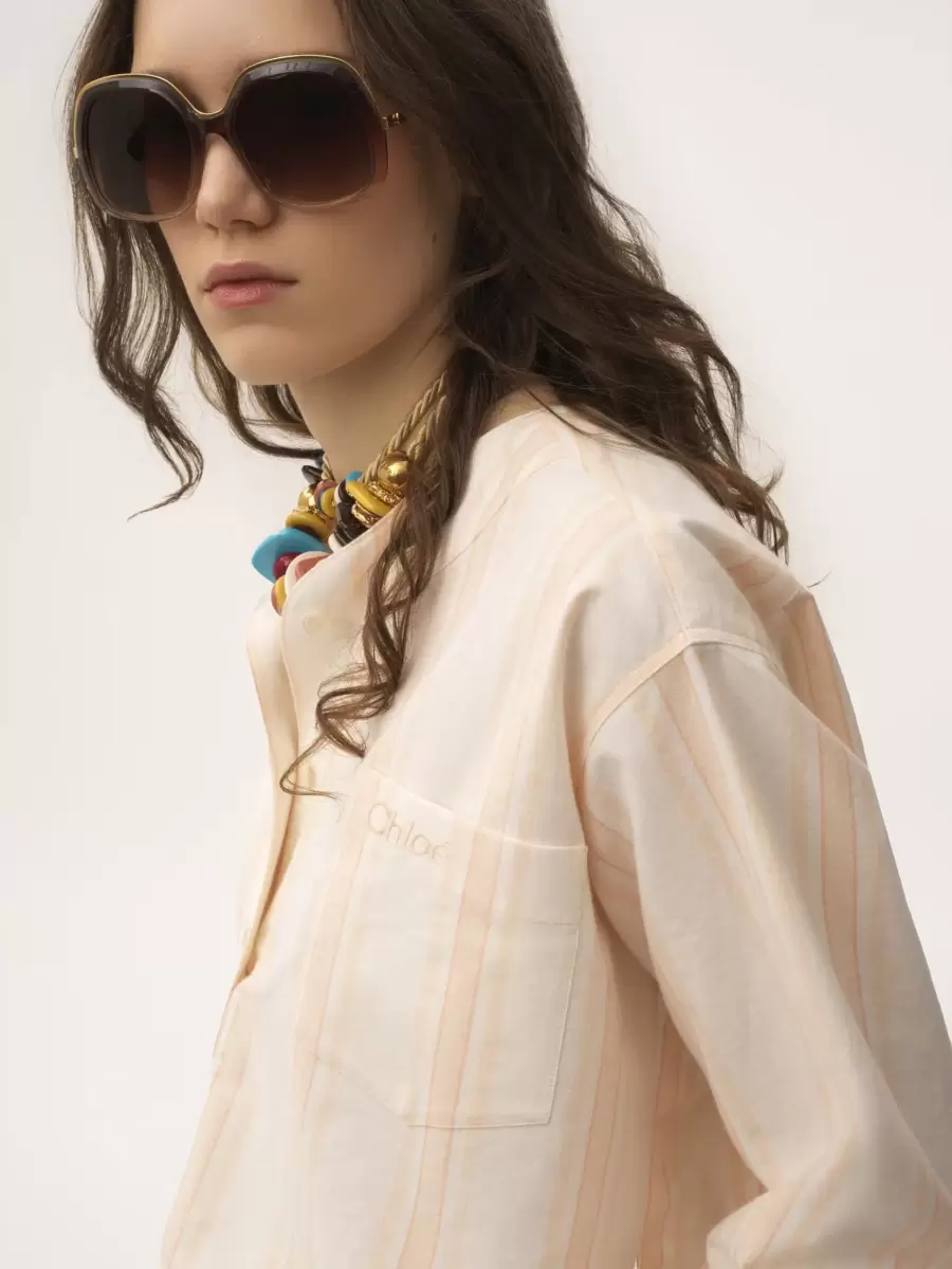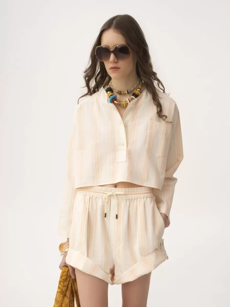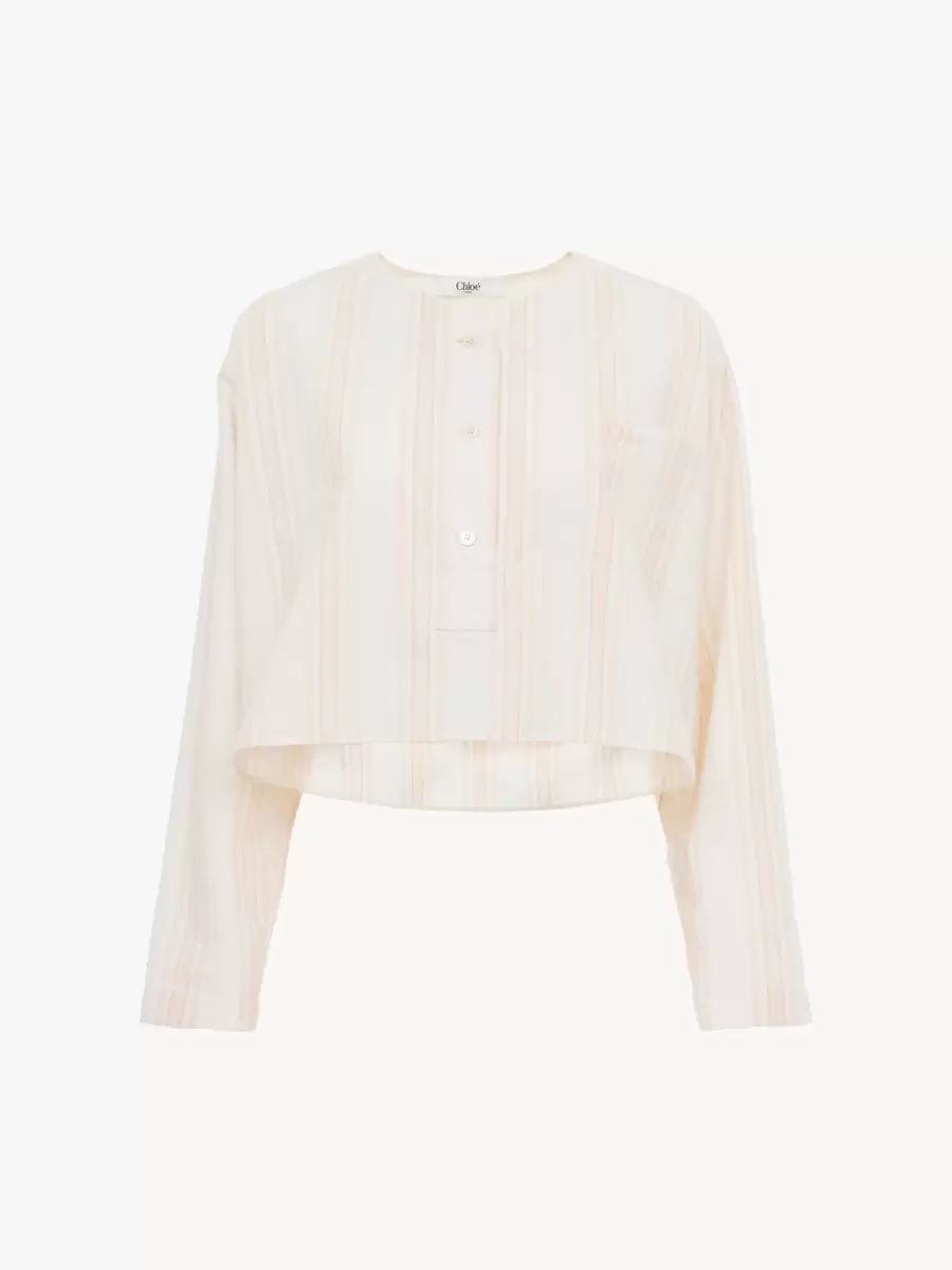 Long-sleeve cropped top in soft striped organic cotton with mother-of-pearl buttons and a patch pocket signed by Chloé logo embroidery.