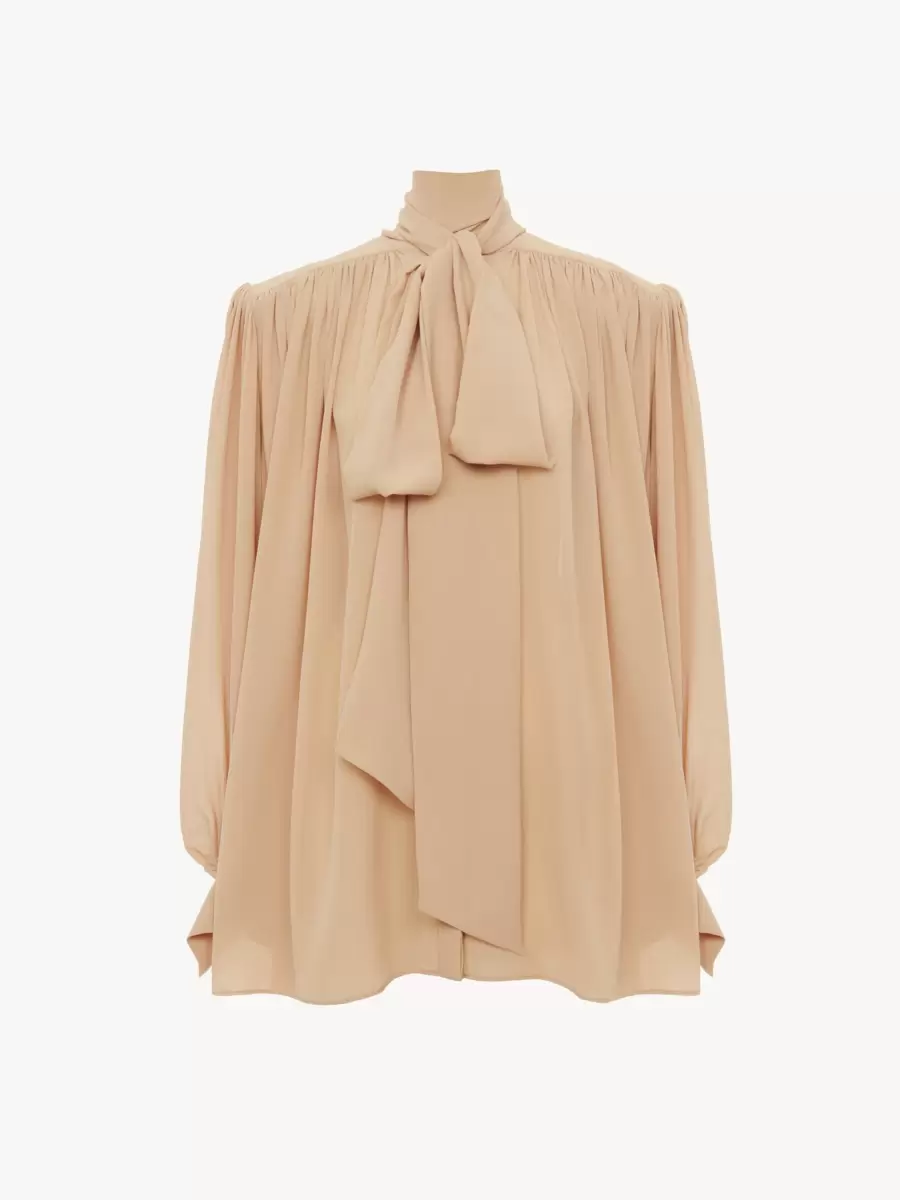 Oversized gathered lavallière blouse in organic silk light crêpe de chine with mother-of-pearl buttons.