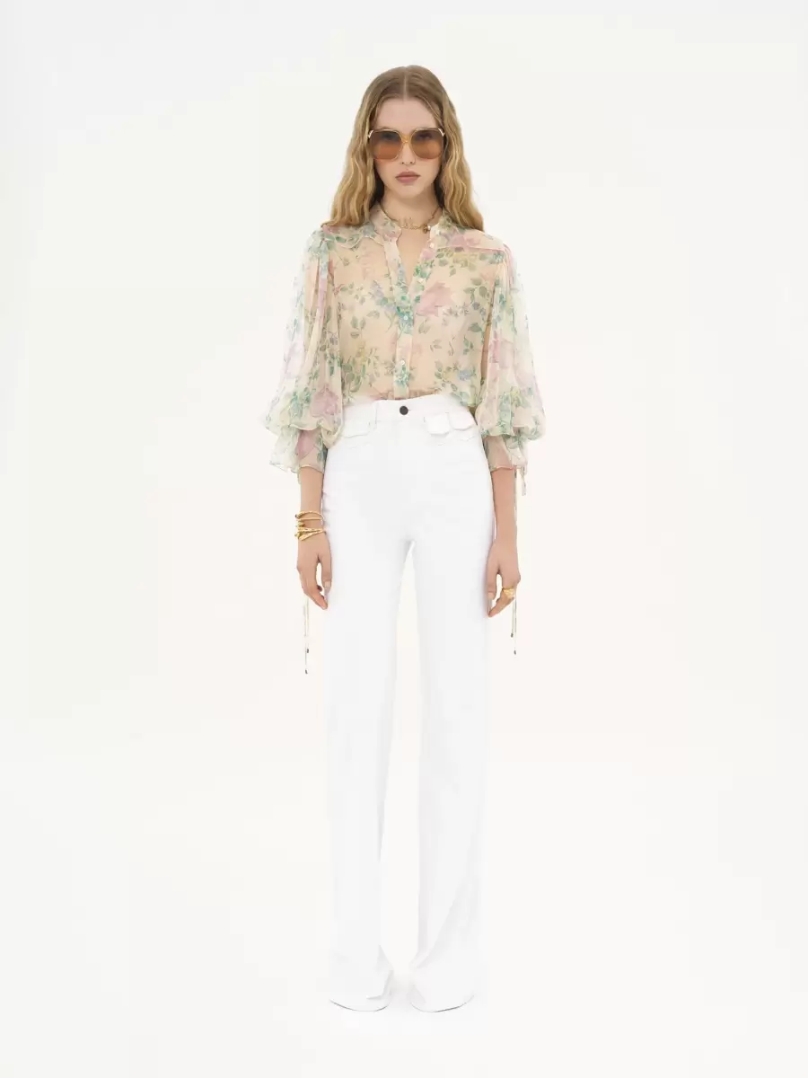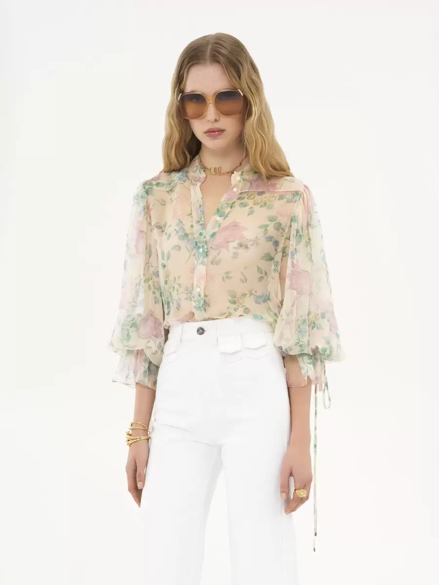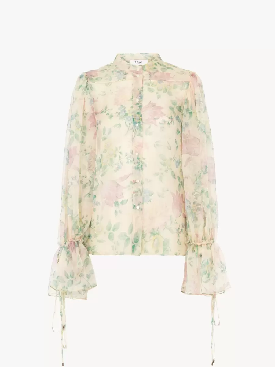 Sheer puff-sleeve blouse in organic silk mousseline with a peonies print inspired by the Maison’s heritage. Mother-of-pearl buttons detail the front, while gathered cuffs with dangling ties and gold-tone metal tips finish this piece.