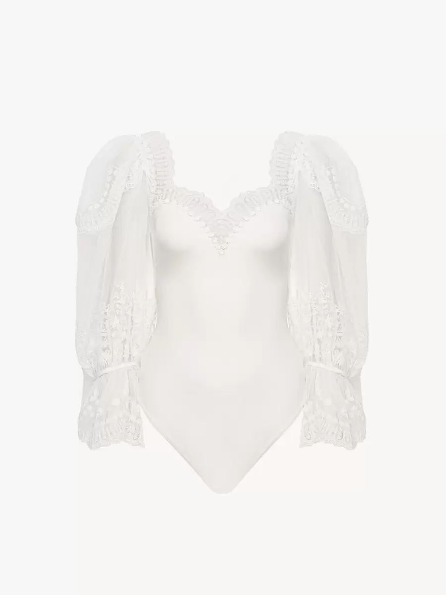 Fitted bodysuit in shiny stretch jersey, featuring sheer puff sleeves and a lace trim rooted in the Maison’s heritage. Dangling ties are finished with gold-tone metal tips.