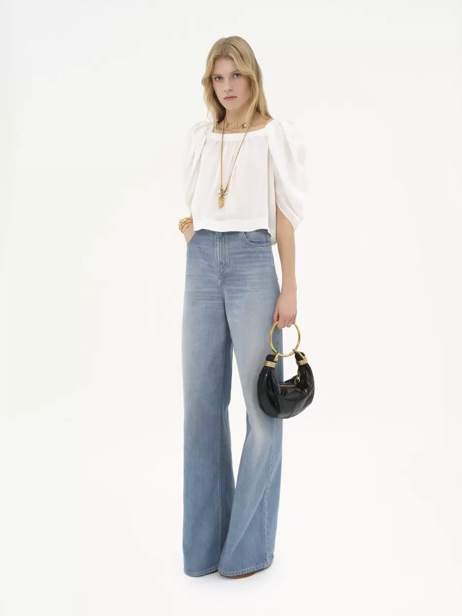 Puff-sleeve pleated top in silk poplin with a square neckline and a fluid silhouette.