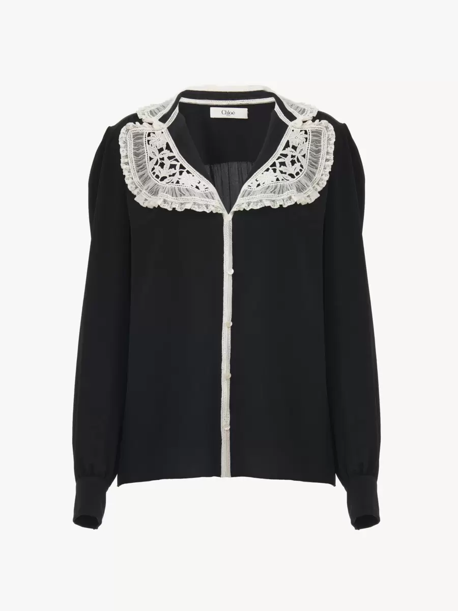 Ruffled blouse in organic silk crêpe de chine with contrast lace trims at the collar and through the button placket. Gathered shoulders and mother-of-pearl buttons finish this silk blouse.