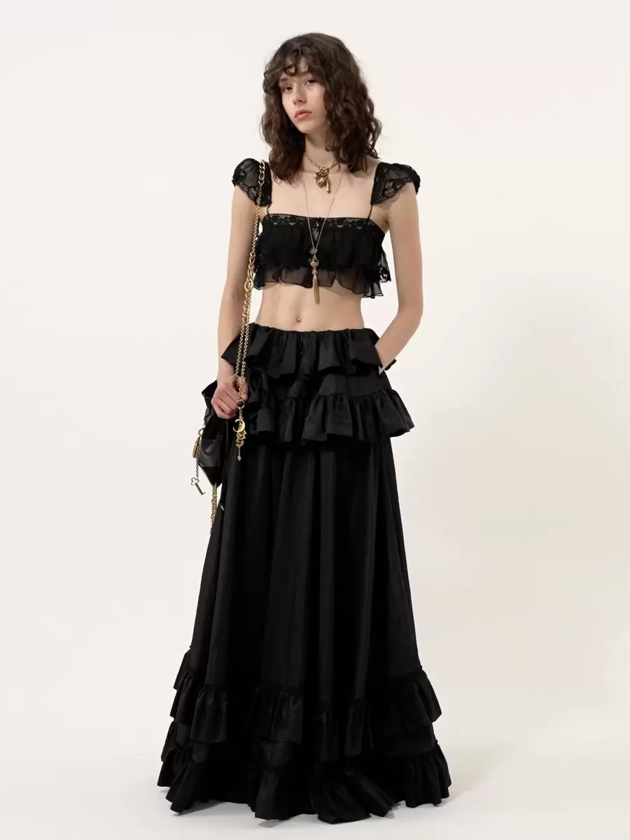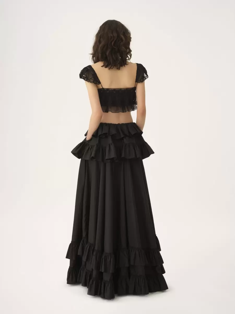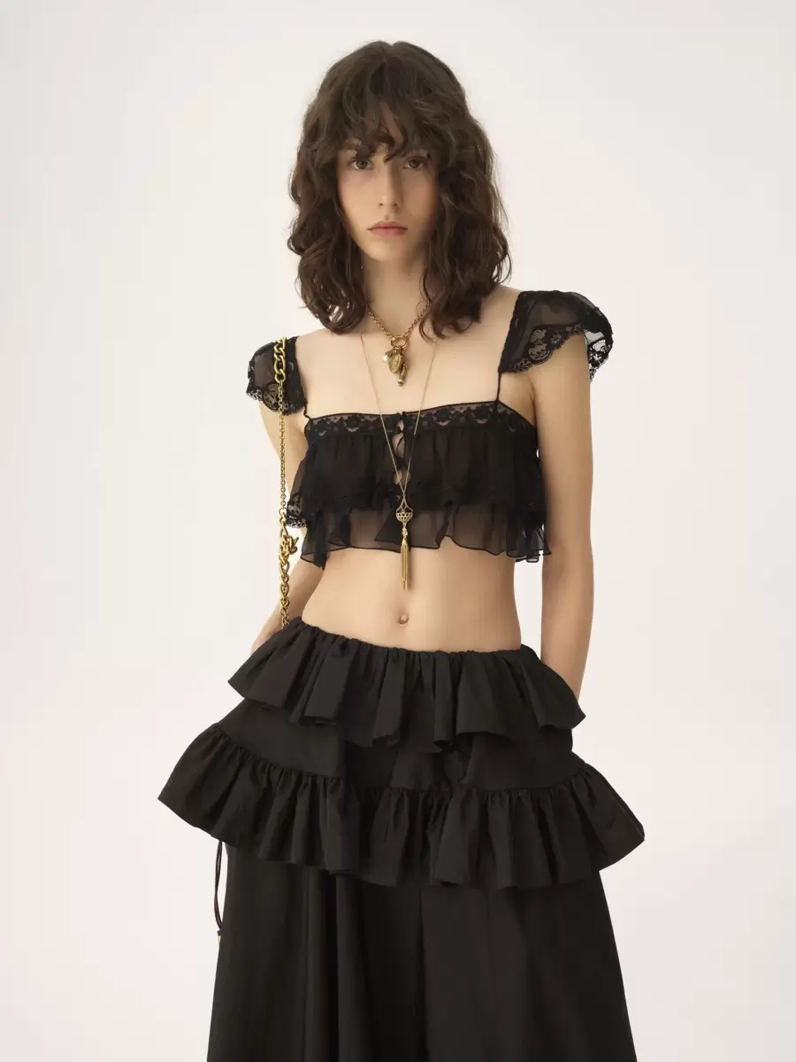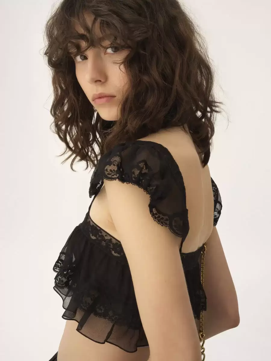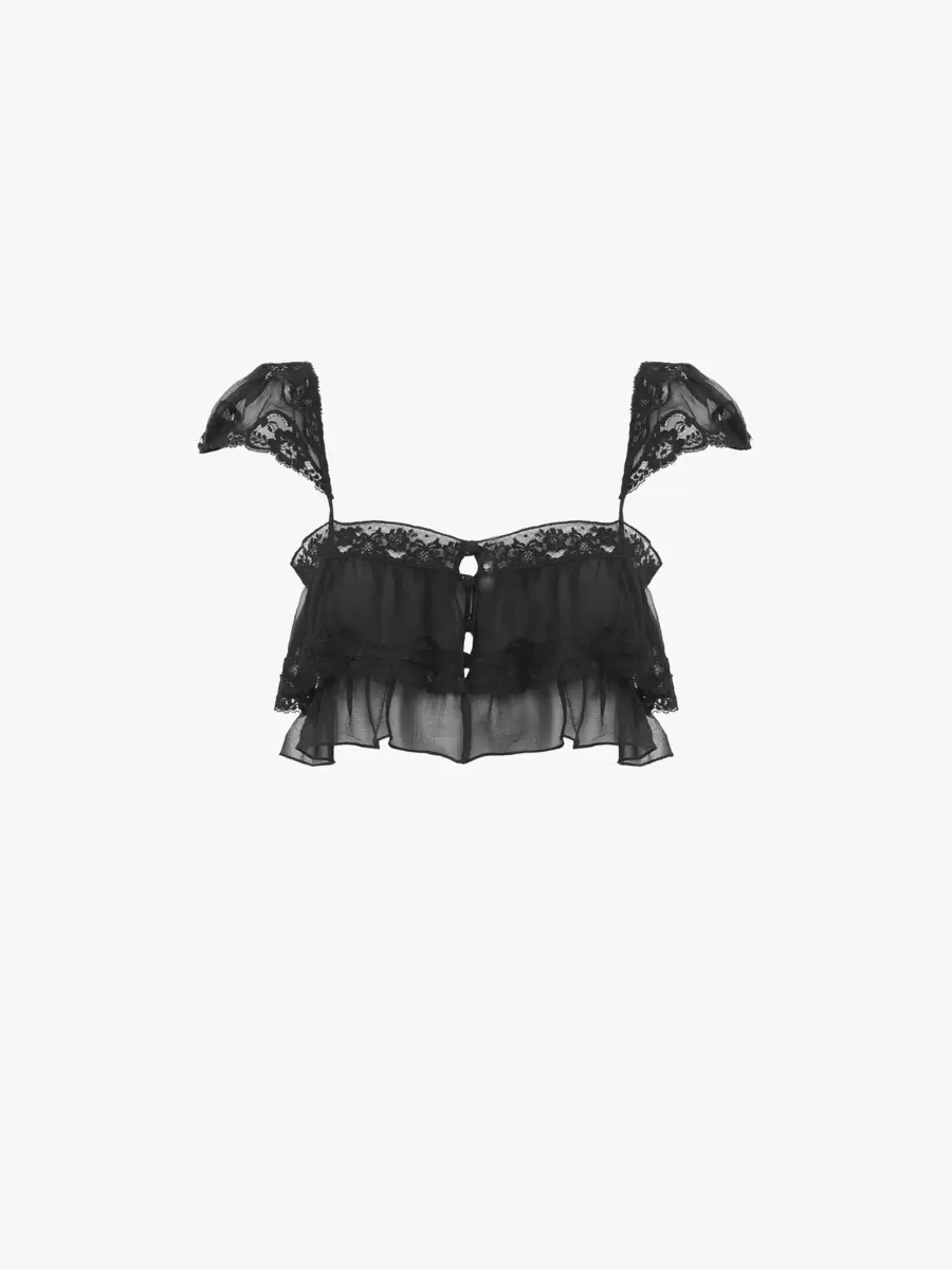 Fluid ruffled bralette in organic silk mousseline, featuring lace trims, cap sleeves and fabric-covered buttons.