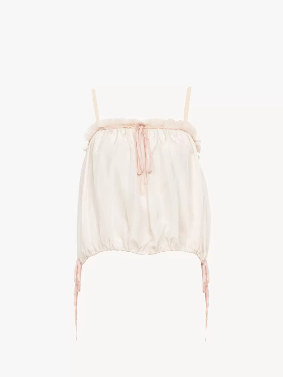 Ruffled camisole top in soft silk habotai with a drawstring neckline and waist, thin straps and ruffle trims.