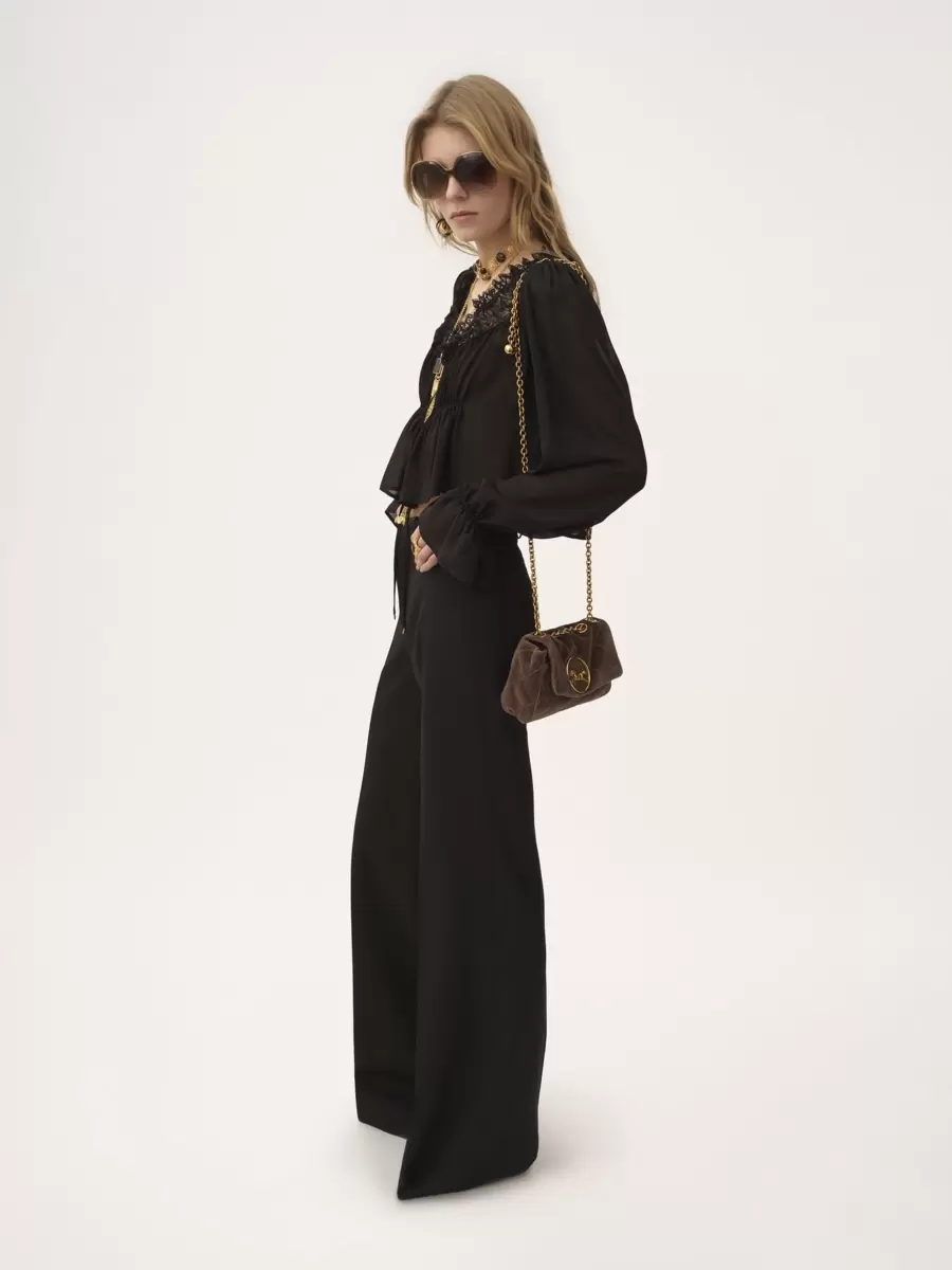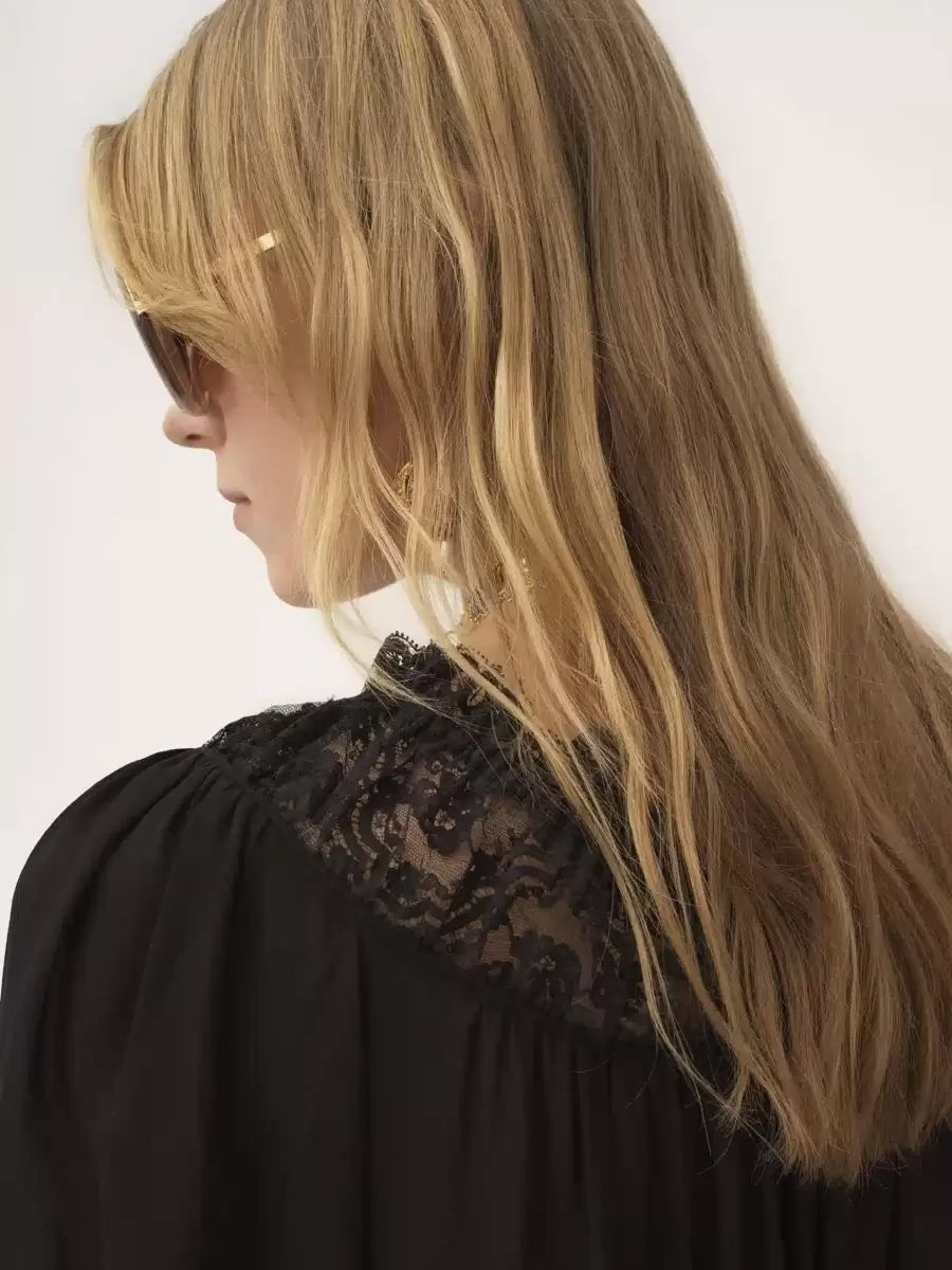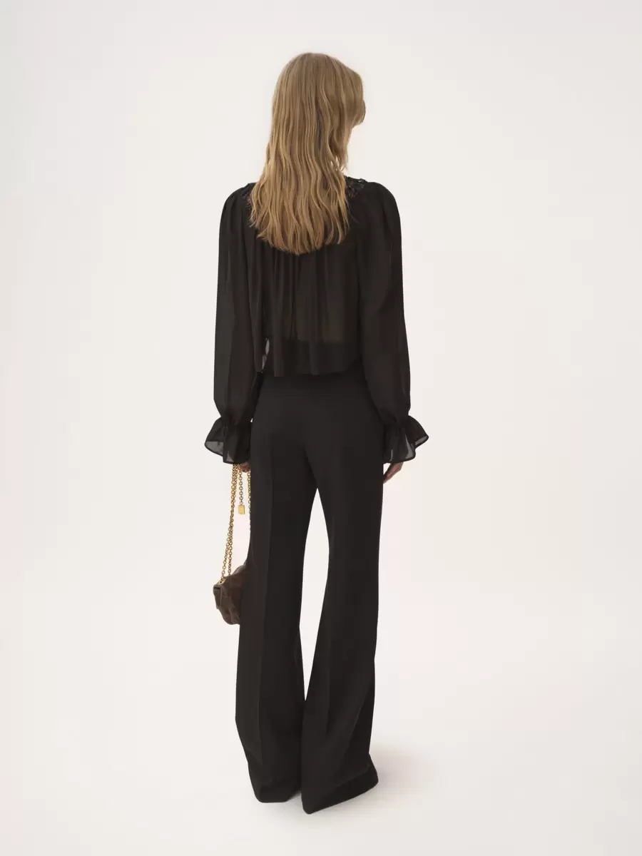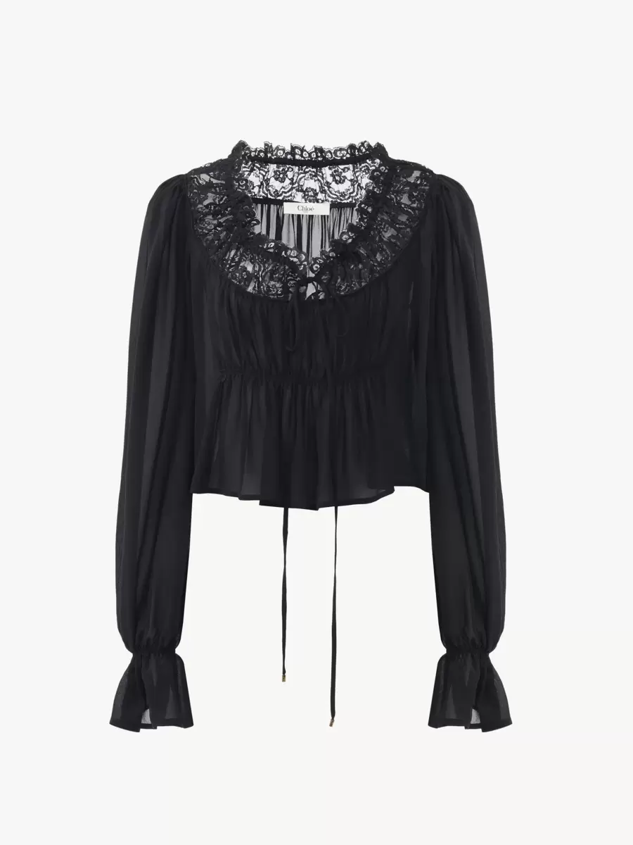 Scoop-neck cropped top in organic silk georgette with floral lace along the neckline and ruching at the front. The drawstring neck and waist have dangling ties with gold-tone metal tips. Elasticated cuffs finish this piece.