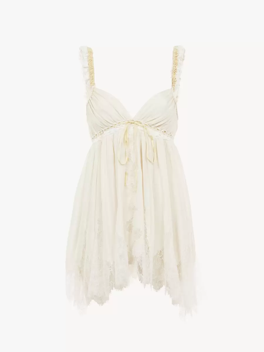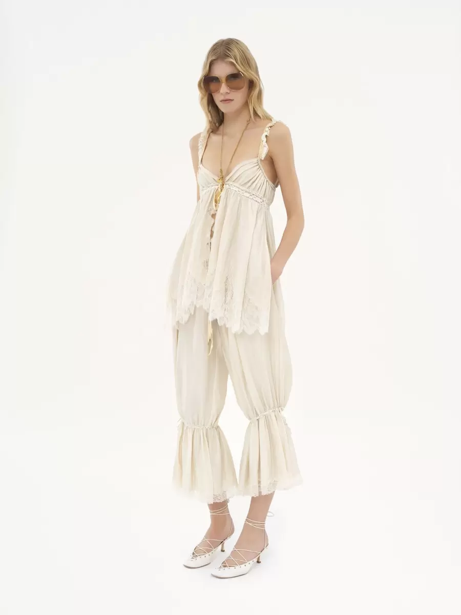 Sleeveless top in washed silk pongé with thin straps, a drawstring empire waist and lace trims.