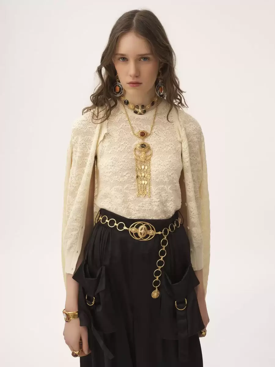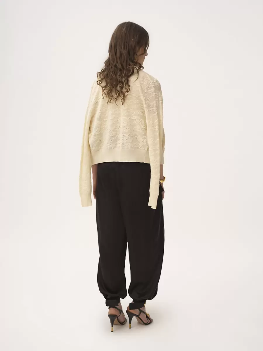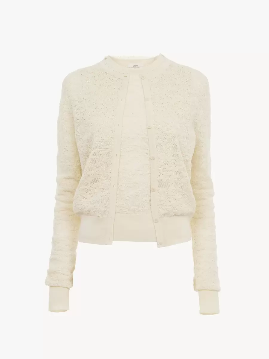 Twin set of a crew-neck tank top and cardigan in a cotton and silk knit with lace-effect stitches and ribbed trims. Mother-of-pearl buttons detail the cardigan, while a tonal Chloé logo patch signs the back of both pieces.