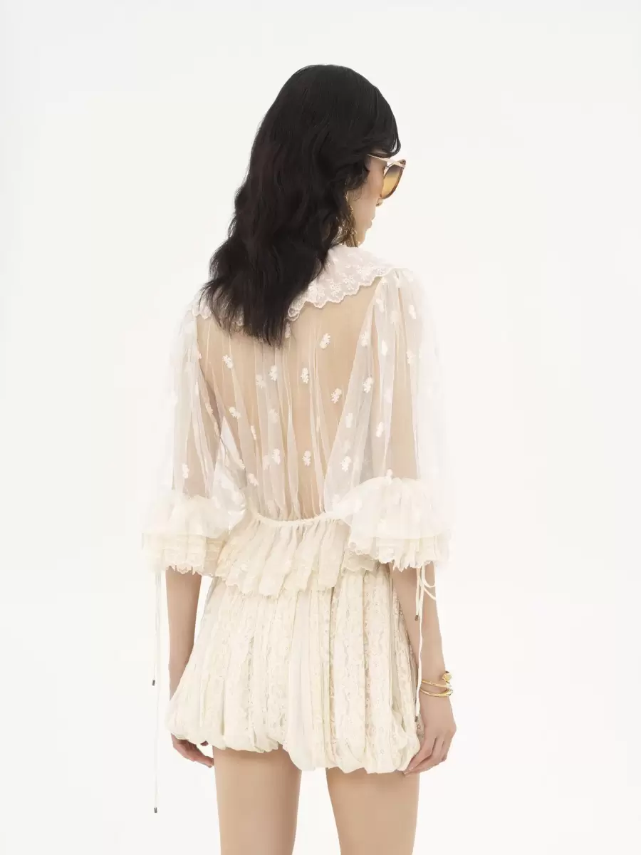 V-neck ruffle top in embroidered lace inspired by the Maison’s heritage. The gathered silhouette features ruffle trims and drawstring ties with gold-tone metal tips.