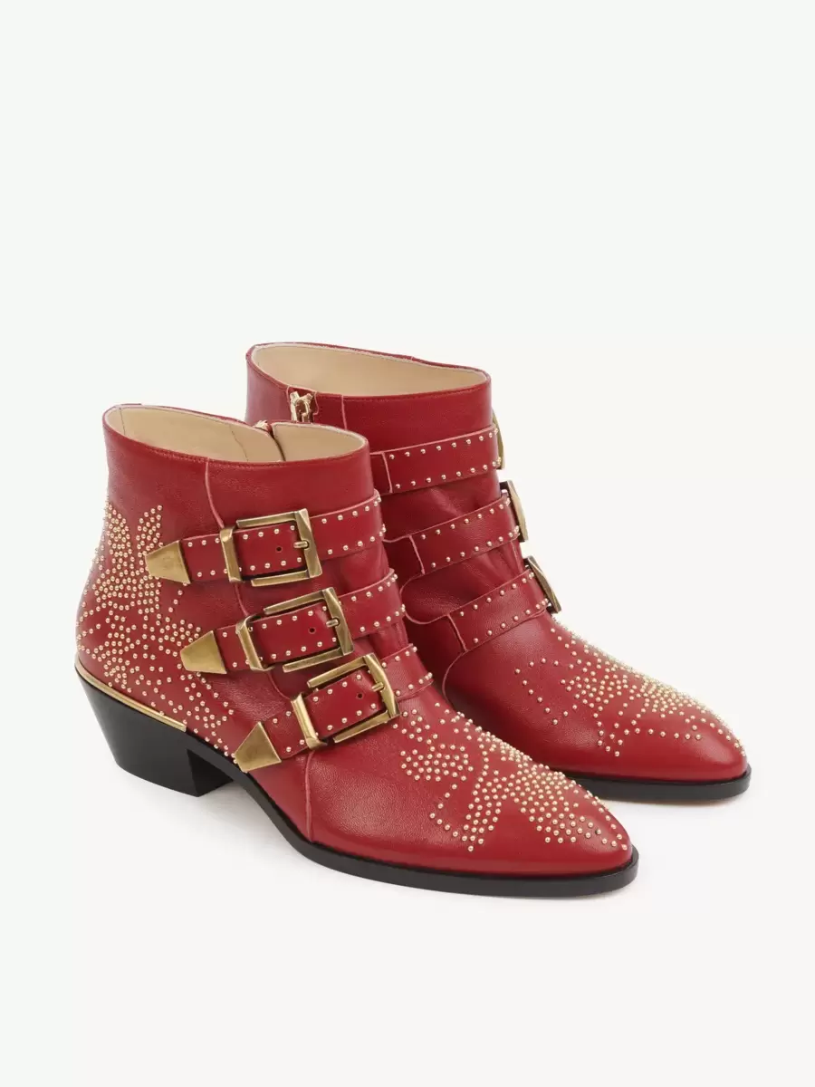 These Susanna ankle boots are crafted from lambskin and finished with the line’s emblematic studs and buckles. The elongated toe shape combines with a Cuban heel and thick sole for a cowboy attitude.