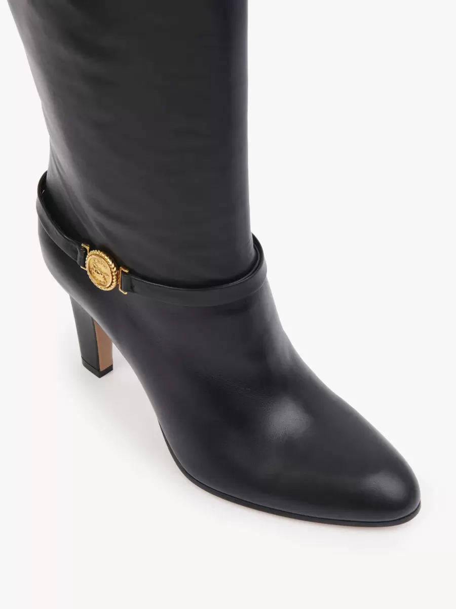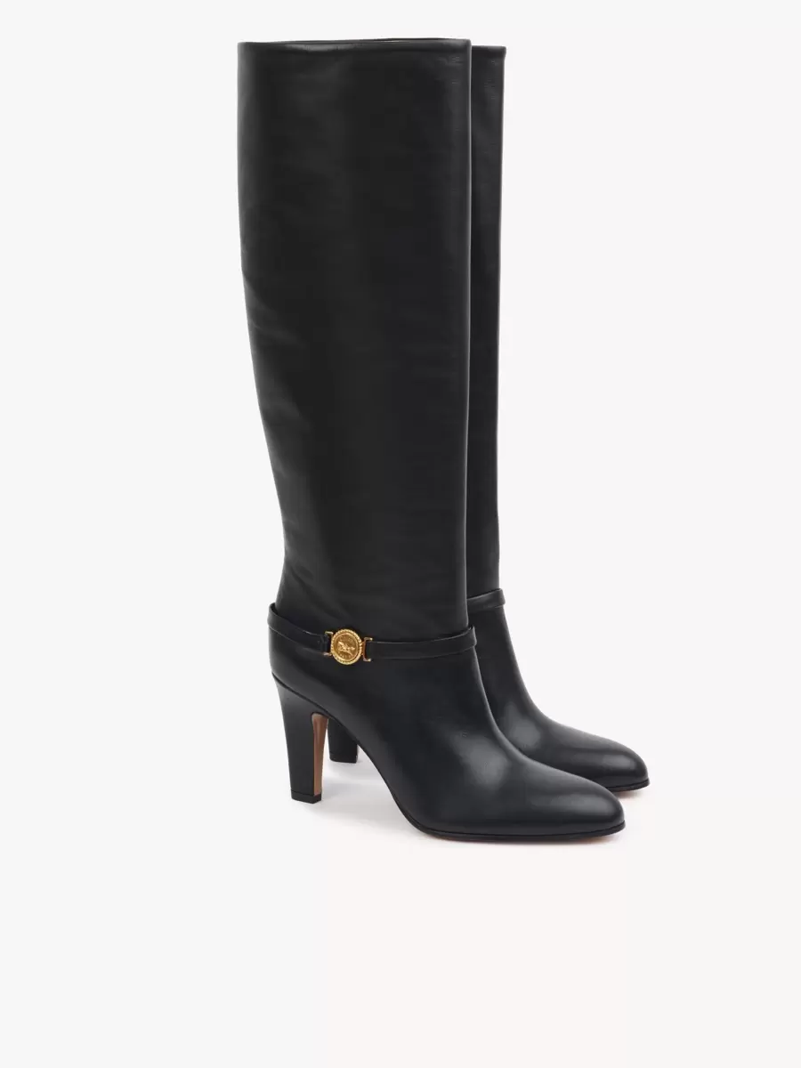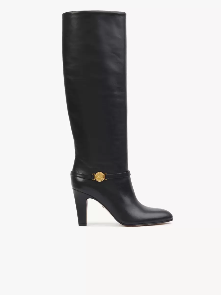 Crafted from supple shiny calfskin, the Eve heeled boots combine a high tube leg with a tapered heel and a classic pointed toe. A leather band around the ankle is embellished with the Maison’s signature gold-tone Horse Medal.