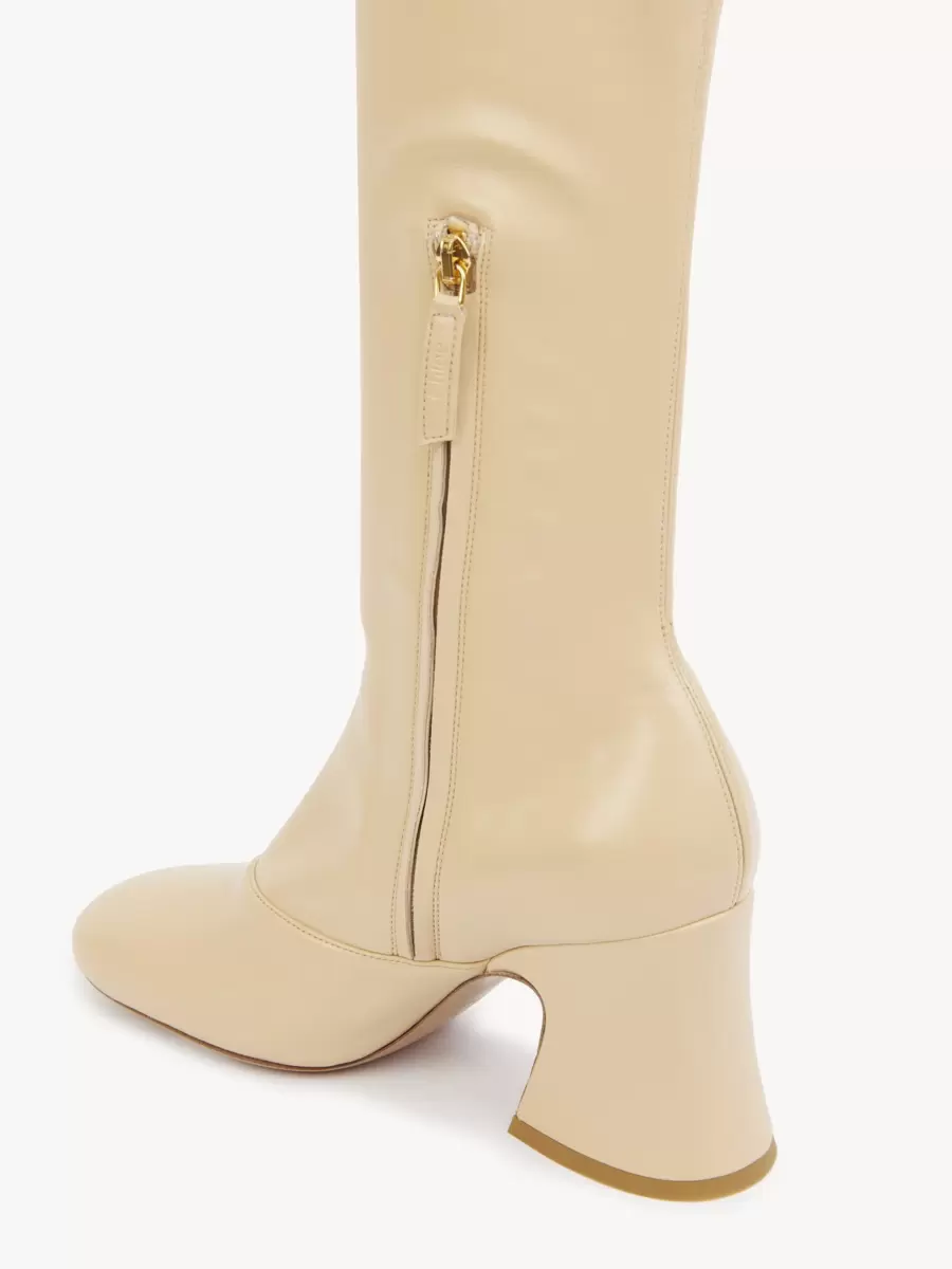 These Janis heeled boots are crafted from soft leather-effect stretch textile for a second-skin fit. Set on a stacked, flared heel, they pair a high tube leg with a subtle square-toe shape.