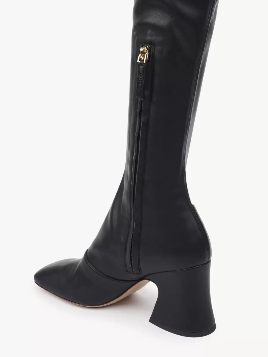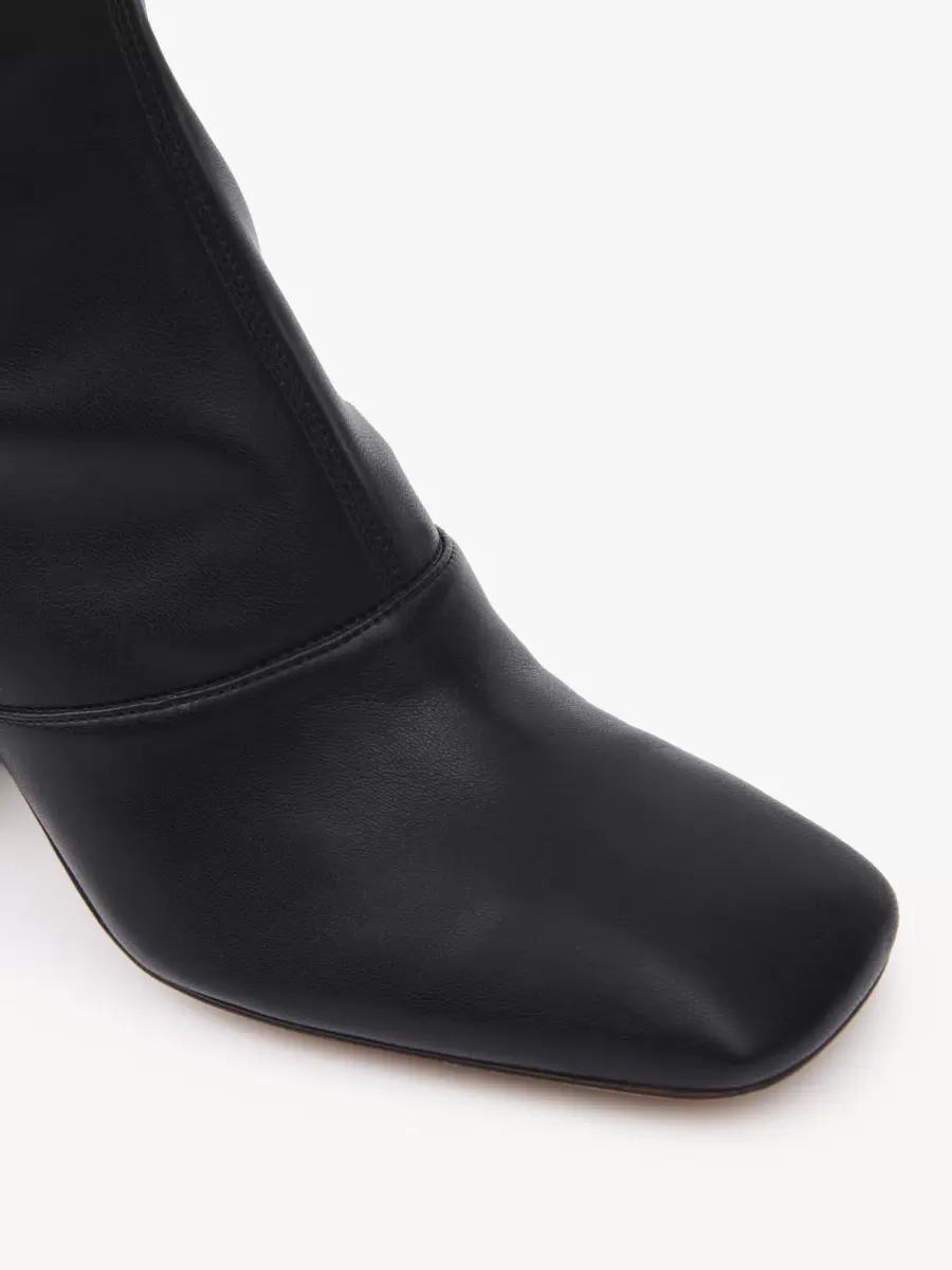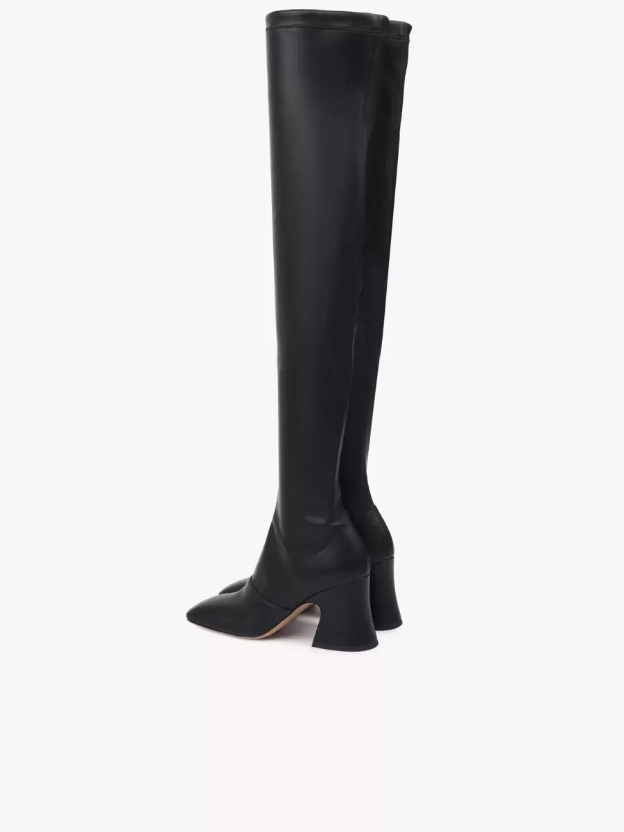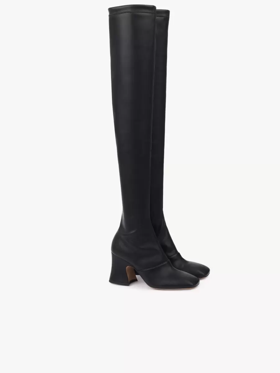 These Janis over-the-knee boots are crafted from soft leather-effect stretch textile with patent leather detail on the toes. Set on a flared block heel, they pair a high tube leg with a subtle square toe shape.