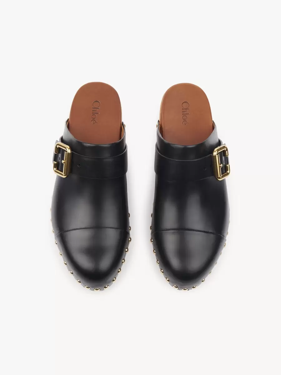 Gold-tone studs and the Maison’s iconic Paddington buckle finish these flat clogs.