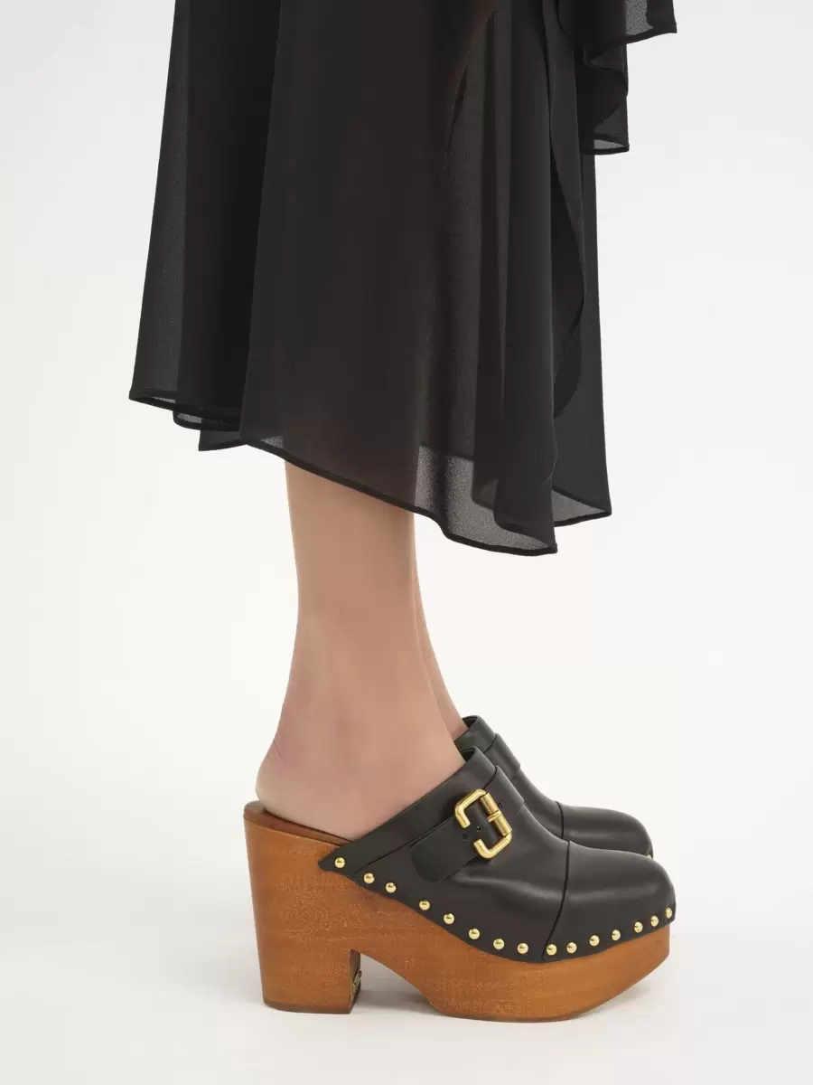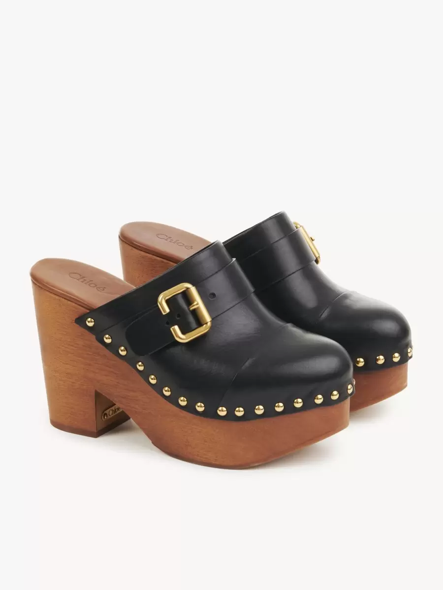Polished hardware complements the leather and wood with gold-tone studs along the upper and a Chloé-branded plate. The archival Paddington buckle finishes this slip-on clog.