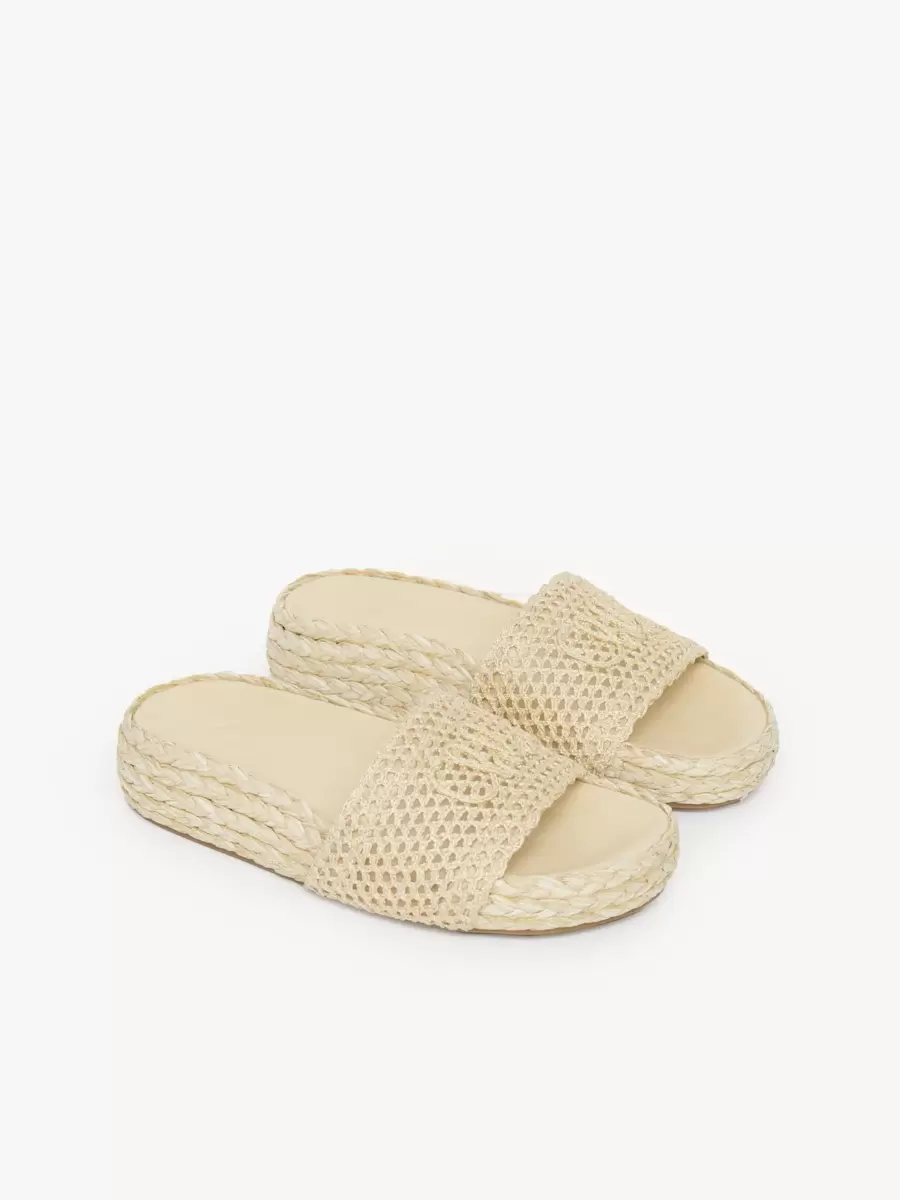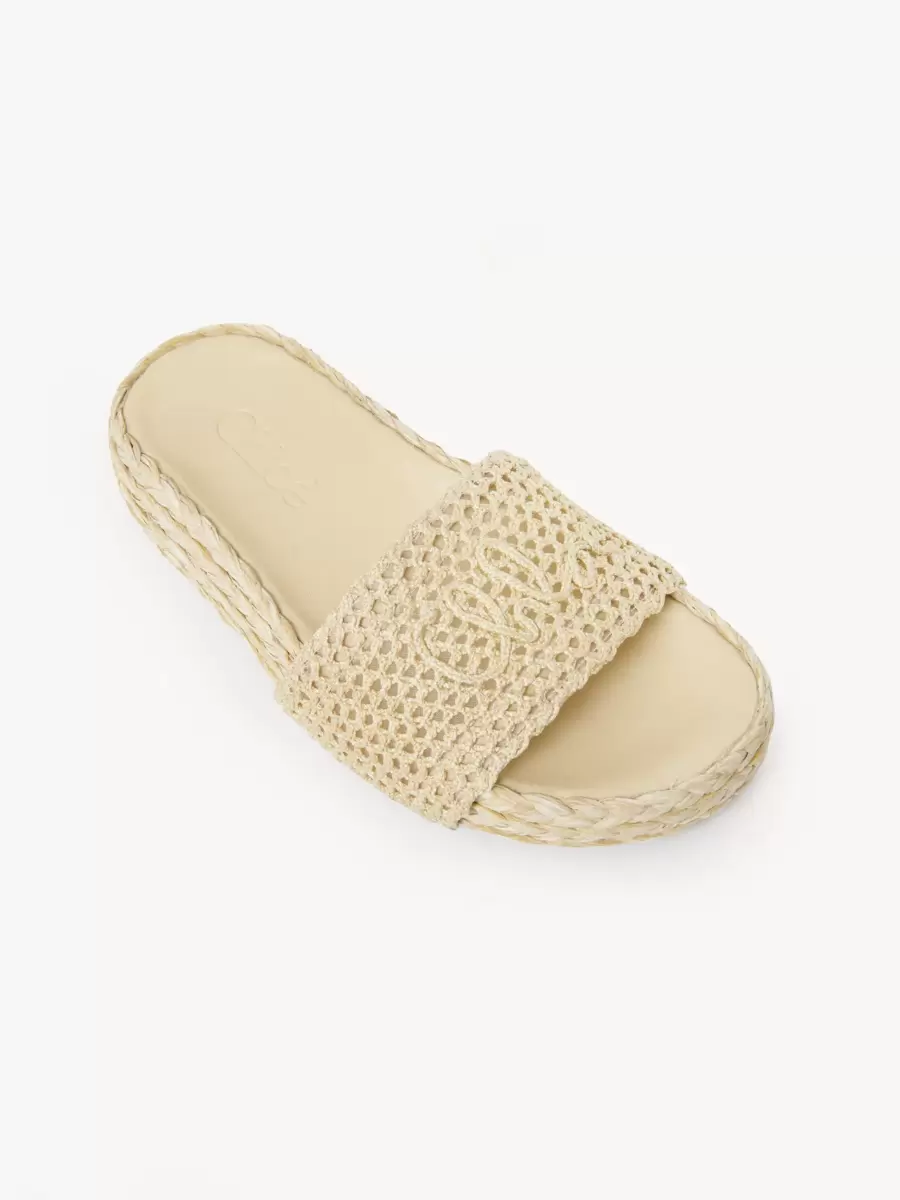 These Isla flatform slides pair a raffia crochet upper with a natural cord sole. The front is embroidered with a handwritten signature inspired by a vintage Chloé belt.