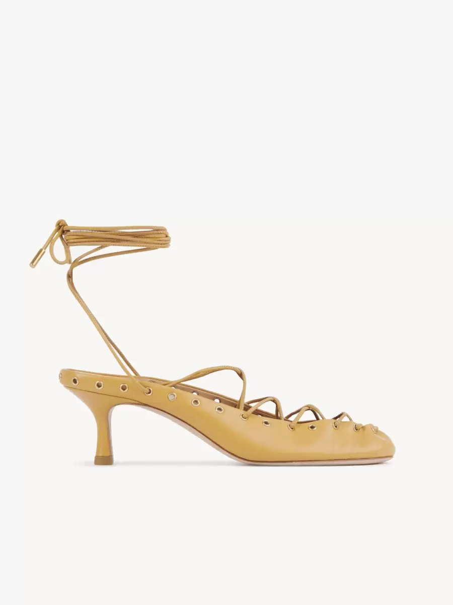 These Chloé Ghillies pumps are crafted from semi-shiny lambskin. Set on a curved kitten heel, they pair an almond toe shape with an open-back silhouette. Corset-inspired lacing and gold-tone hardware finish these light leather pumps.