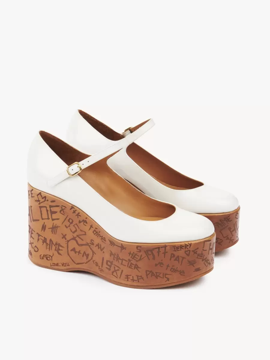 The Maxime wedge pumps feature a Mary Jane upper in patent calfskin, set on a wood-effect platform structure.