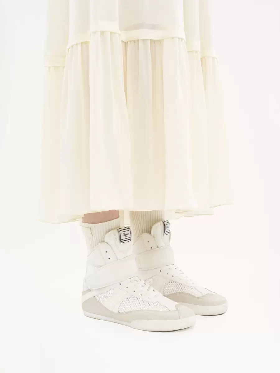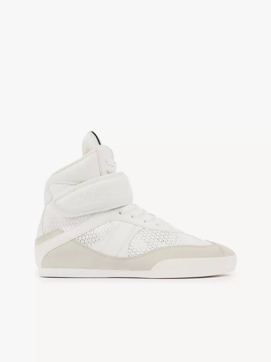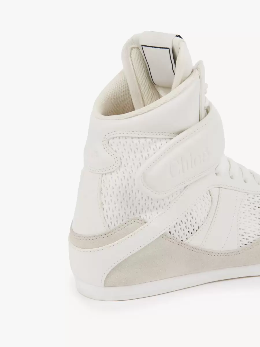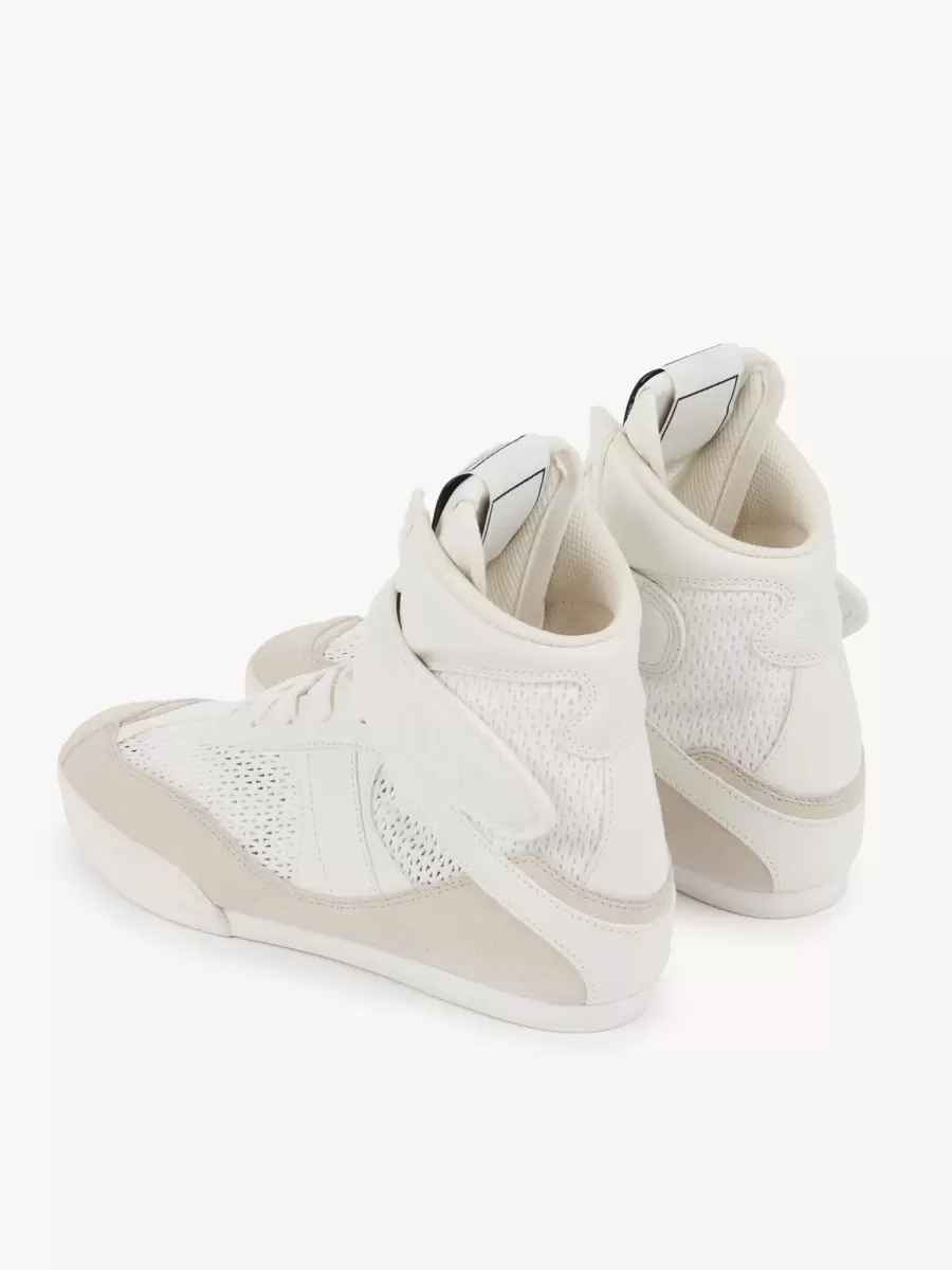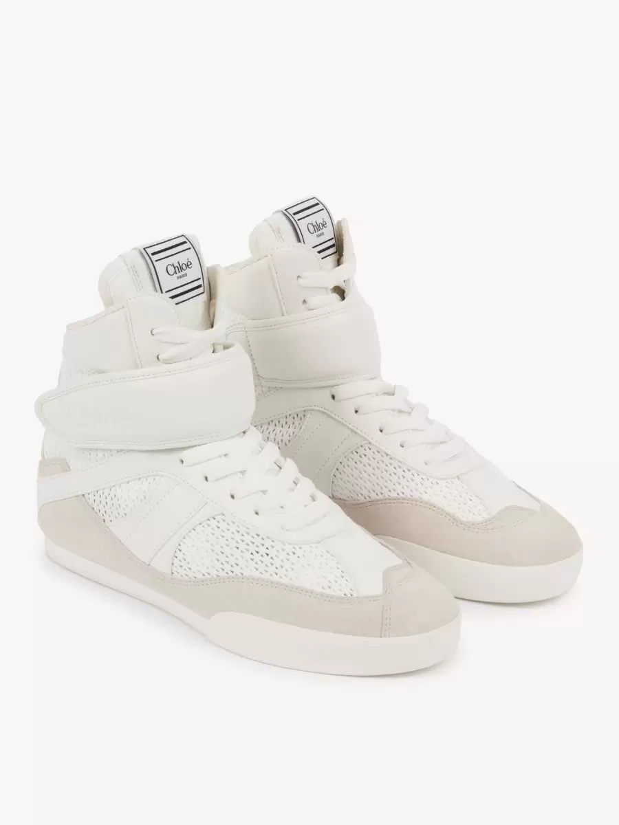 Inspired by the ballet and boxing worlds, these Chloé Kick high-top sneakers are crafted from recycled mesh and smooth suede calfskin. The slim silhouette pairs an almond toe with a high ankle secured by a wide leather strap debossed with the Chloé logo.
