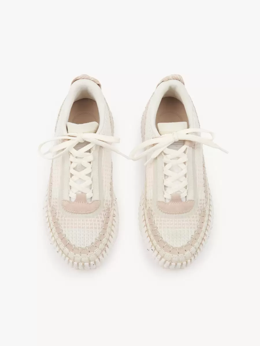 The Nama sneakers are crafted from recycled materials in a mix of contrasting colors and textures. These sneakers are set on an iconic, lightweight and ultra-comfortable sole with a speckled effect, and finished with immaculate blanket stitching which takes 4.5 hours to complete by hand. The Chloé logo signs the back.