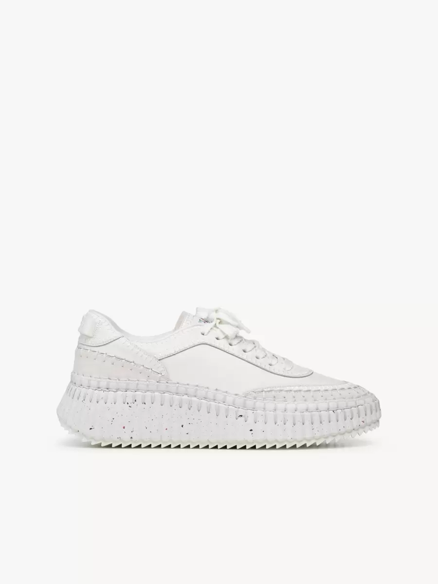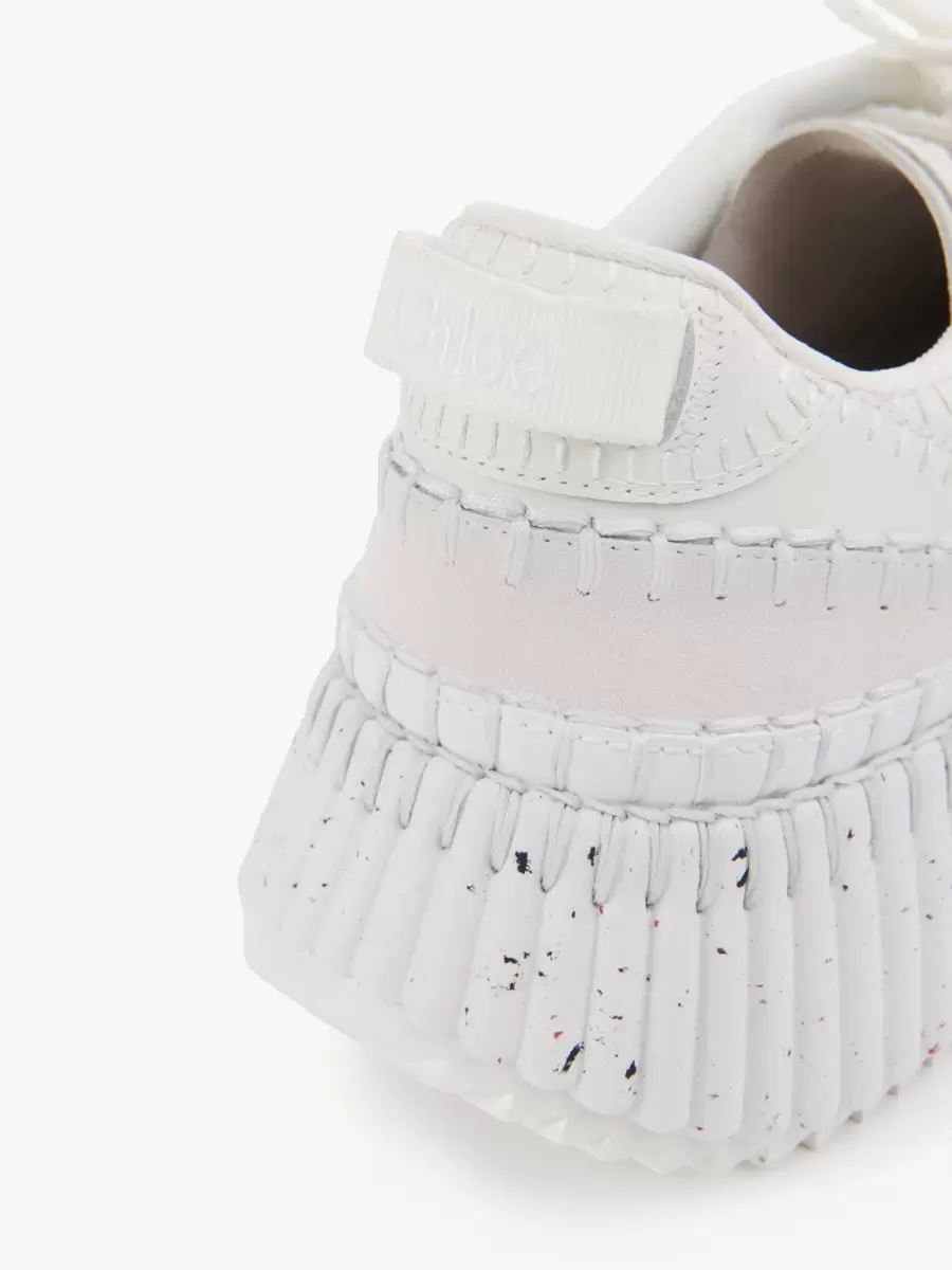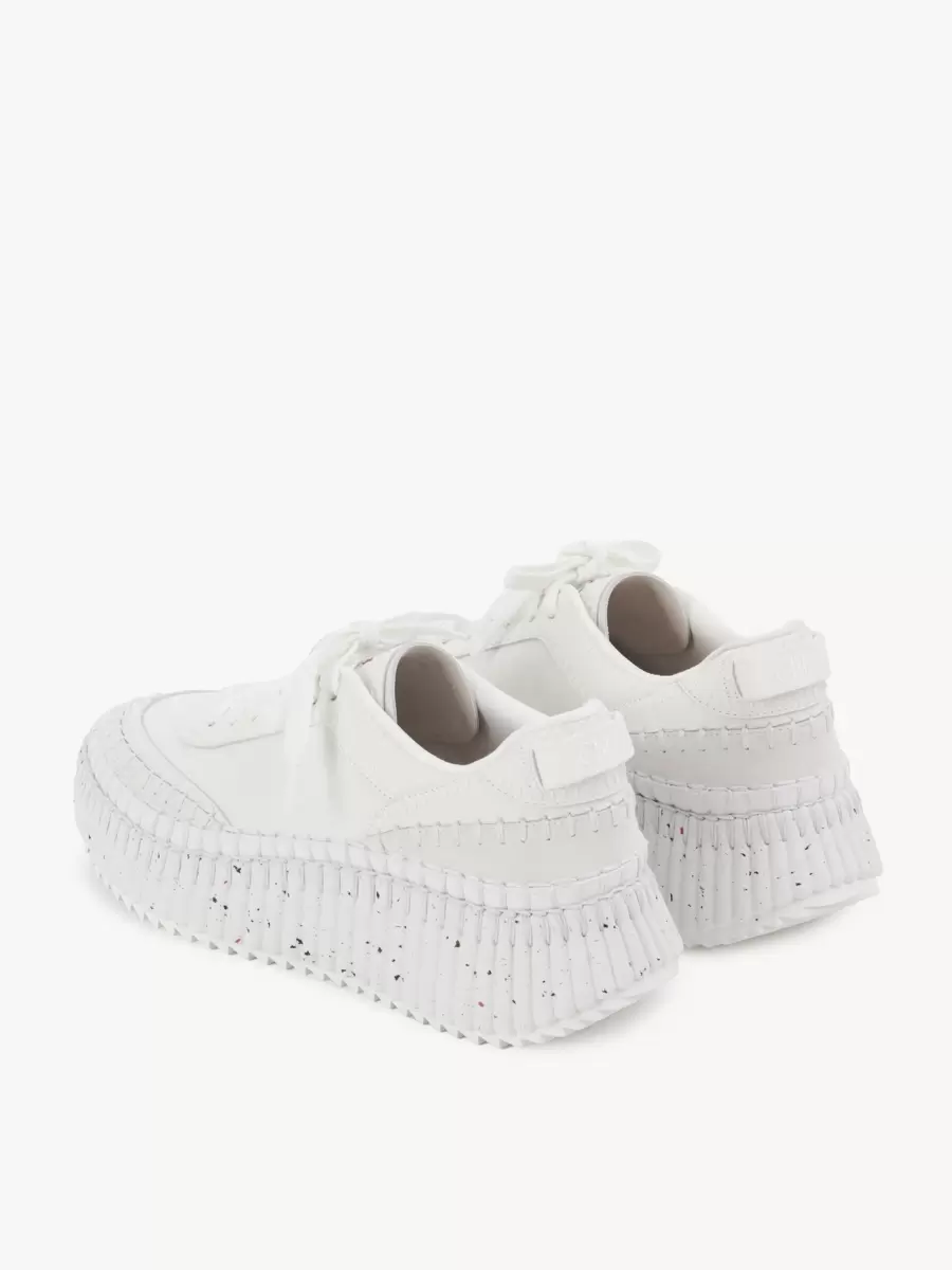 Chloé’s iconic Nama sneaker is revisited in a monochrome version crafted from a calfskin mix for a subtle textural interplay elevated by the line’s distinctive hand-stitching.